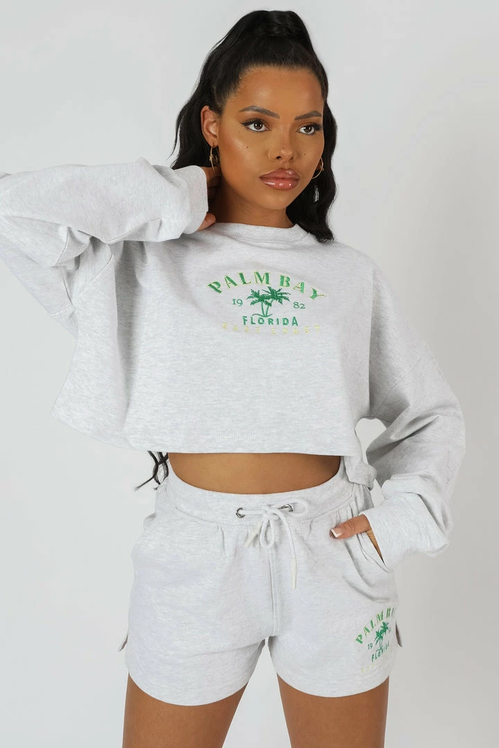 AN OVERSIZED FIT CROPPED SWEATSHIRT IN OATMEAL MARL WITH PALM BEACH PRINTED ON THE FRONT. PAIR WITH THE HIGH WAISTED SLOGAN DRAWSTRING MINI SHORTS IN OATMEAL MARL.