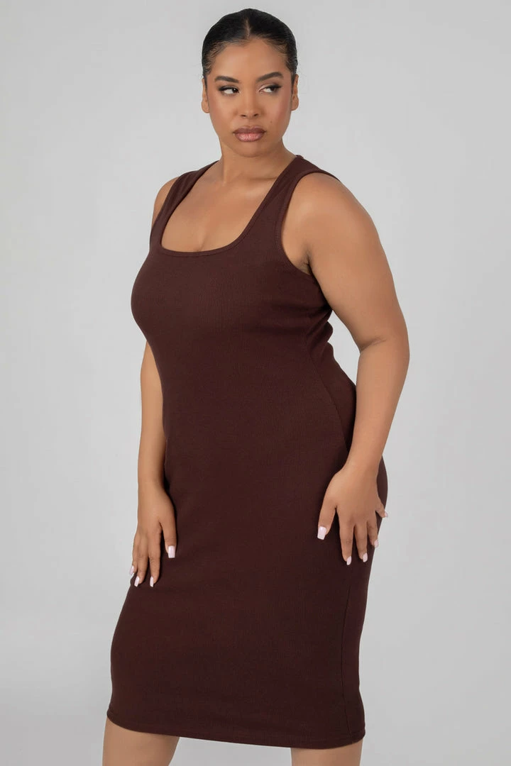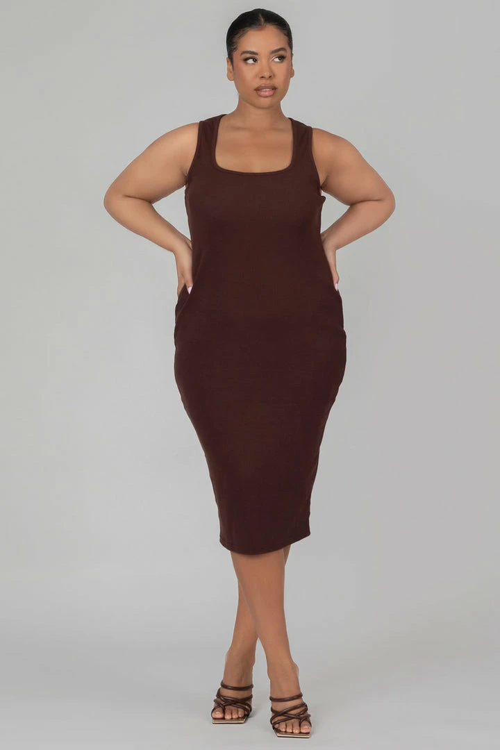 RIBBED MIDI DRESS WITH THICK STRAPS AND SCOOP NECK LINE IN CHOCOLATE.