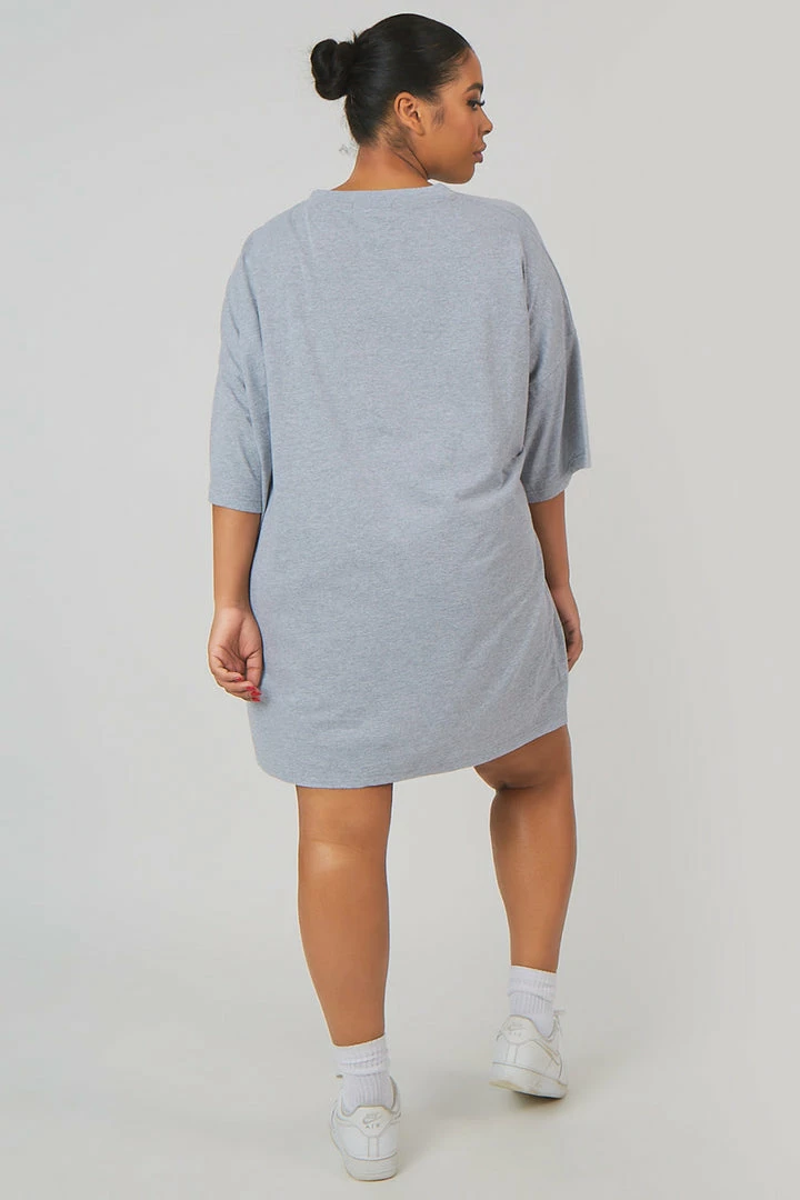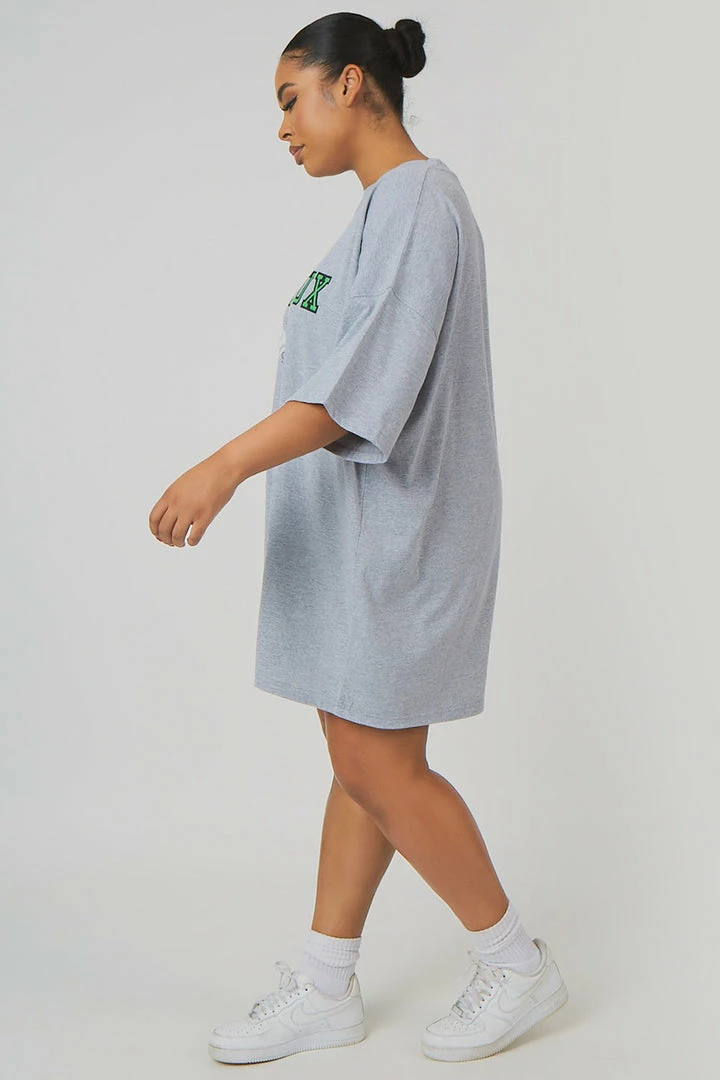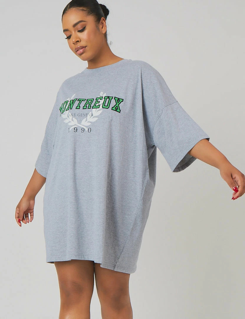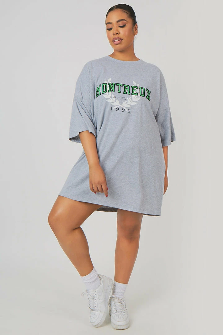 An oversized fit t-shirt dress in grey with ‘MONTREUX’ printed on in green.