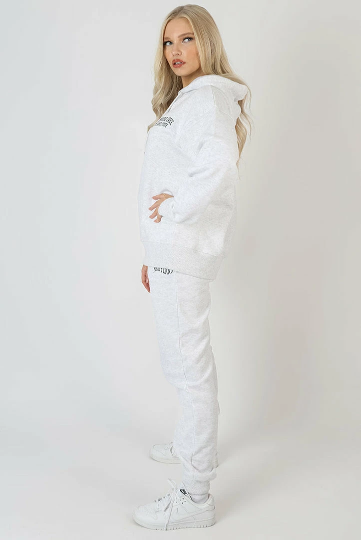 OVERSIZED FIT SEAM FRONT HIGH WAISTED JOGGERS WITH A DRAWSTRING IN OATMEAL MARL WITH A SLOGAN IN A WAVE EMBROIDERED ON