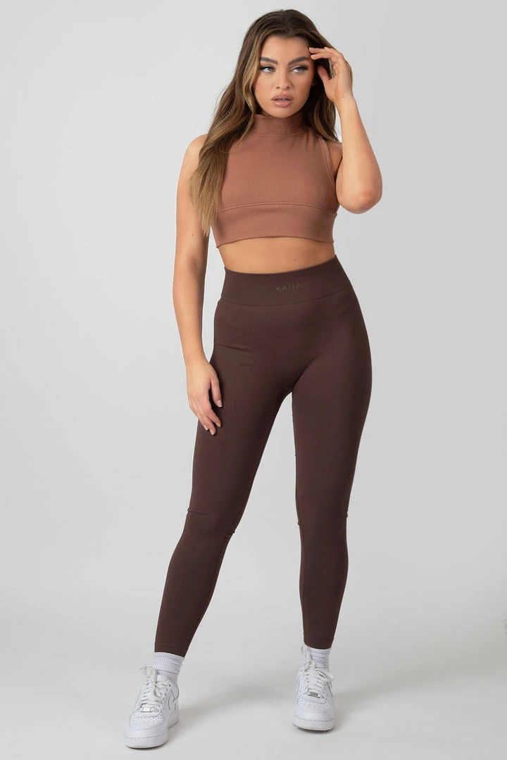 A high neck racer back crop top in cinnamon featuring dropped sides made of a flattering thick ribbed material
