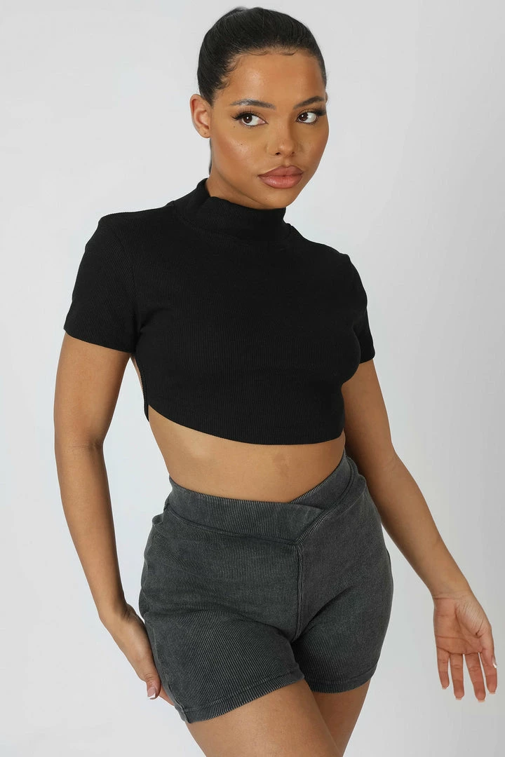 A backless crop top in black made of a flattering ribbed material with an open back and a tie at the bottom.