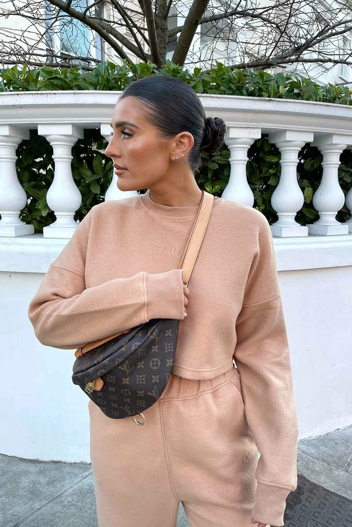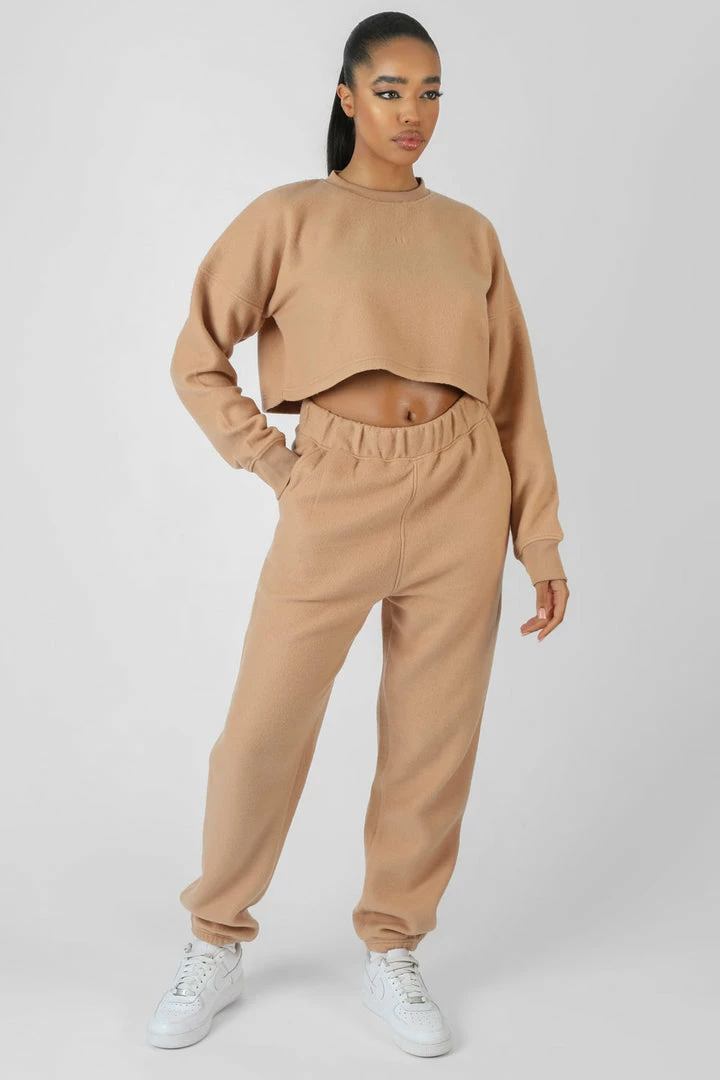 AN OVERSIZED FIT CAMEL CROPPED CREW NECK SWEATSHIRT IN A SOFT FLUFFY MATERIAL.Â