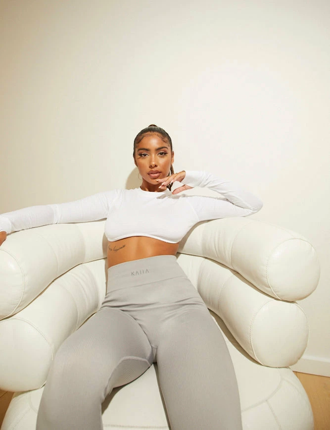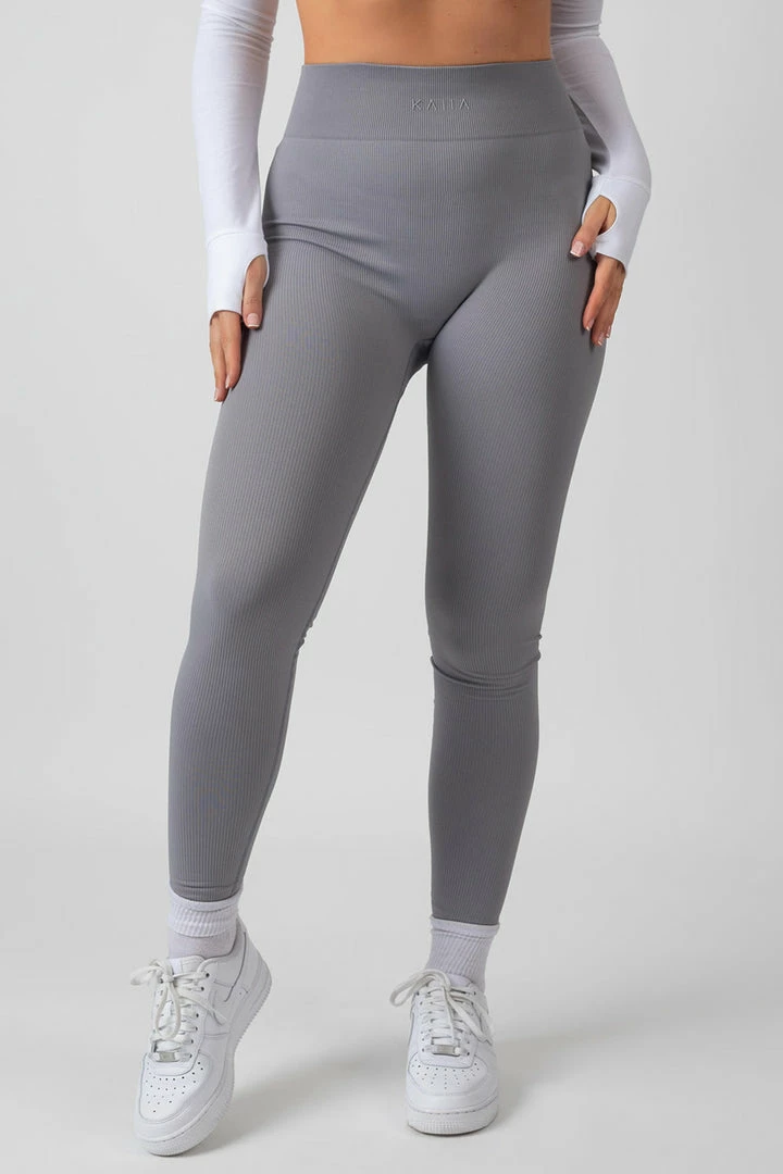 seamless ribbed leggings in grey with a logo detail on the front.