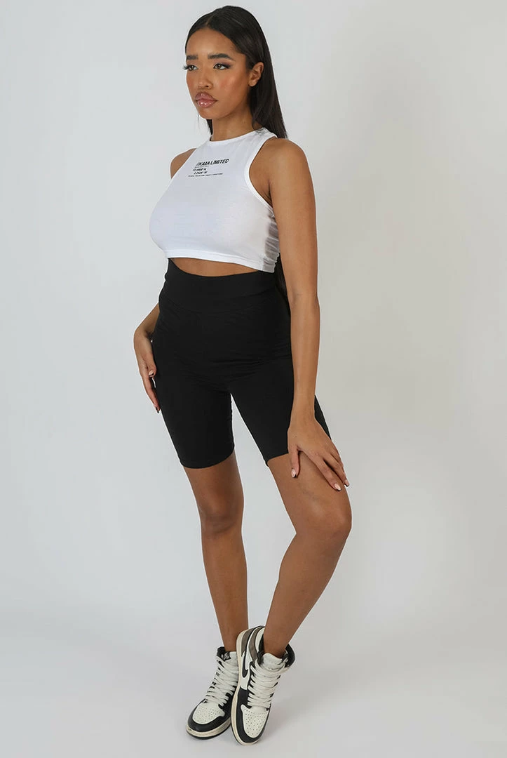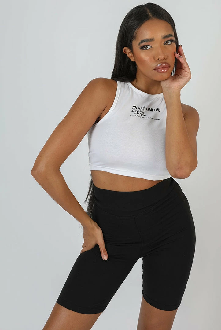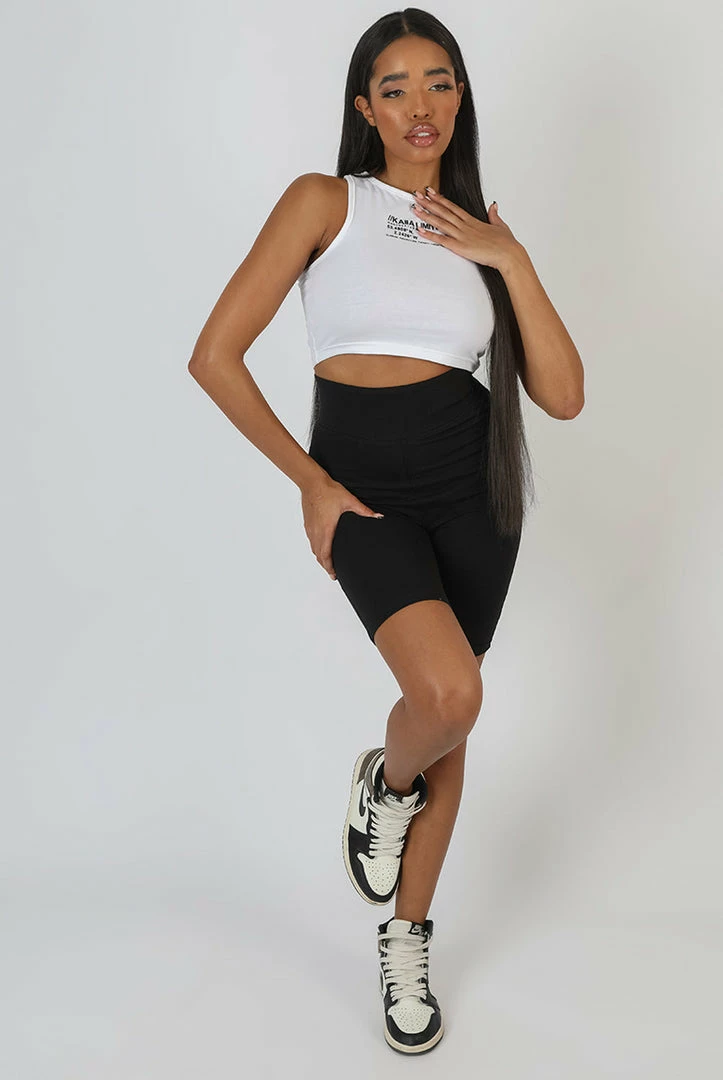 A racer crop top in white with KAIIA and details printed on in contrasting black.