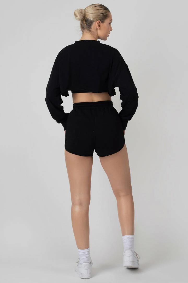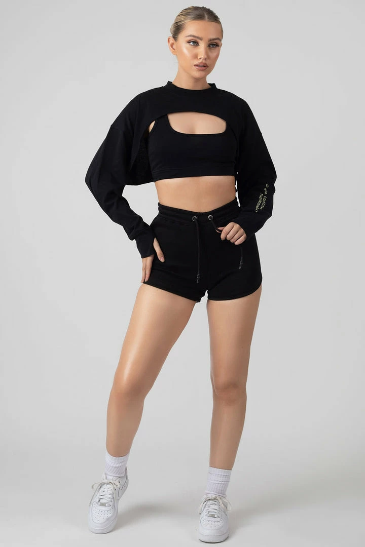 A black crop top with KAIIA detailing and a super cropped long sleeved t-shirt to layer over with detailimng down the sleeve.