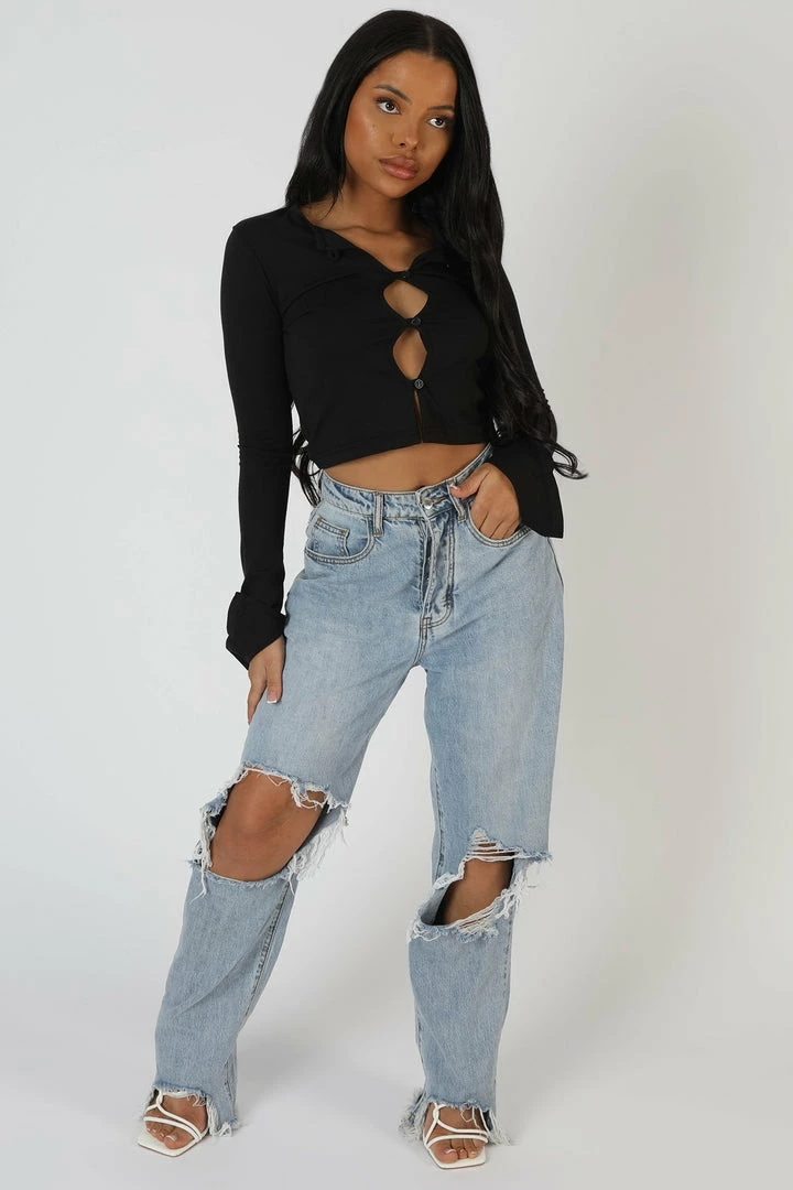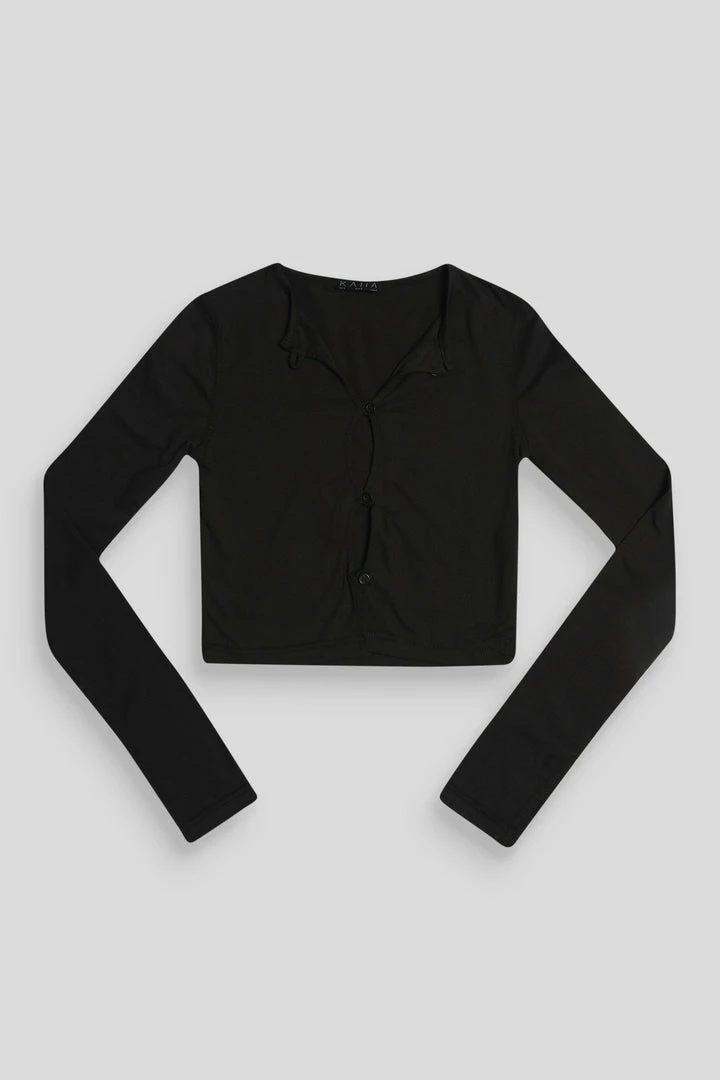 LONG SLEEVE CROP TOP IN BLACK WITH BUTTON DETAILING