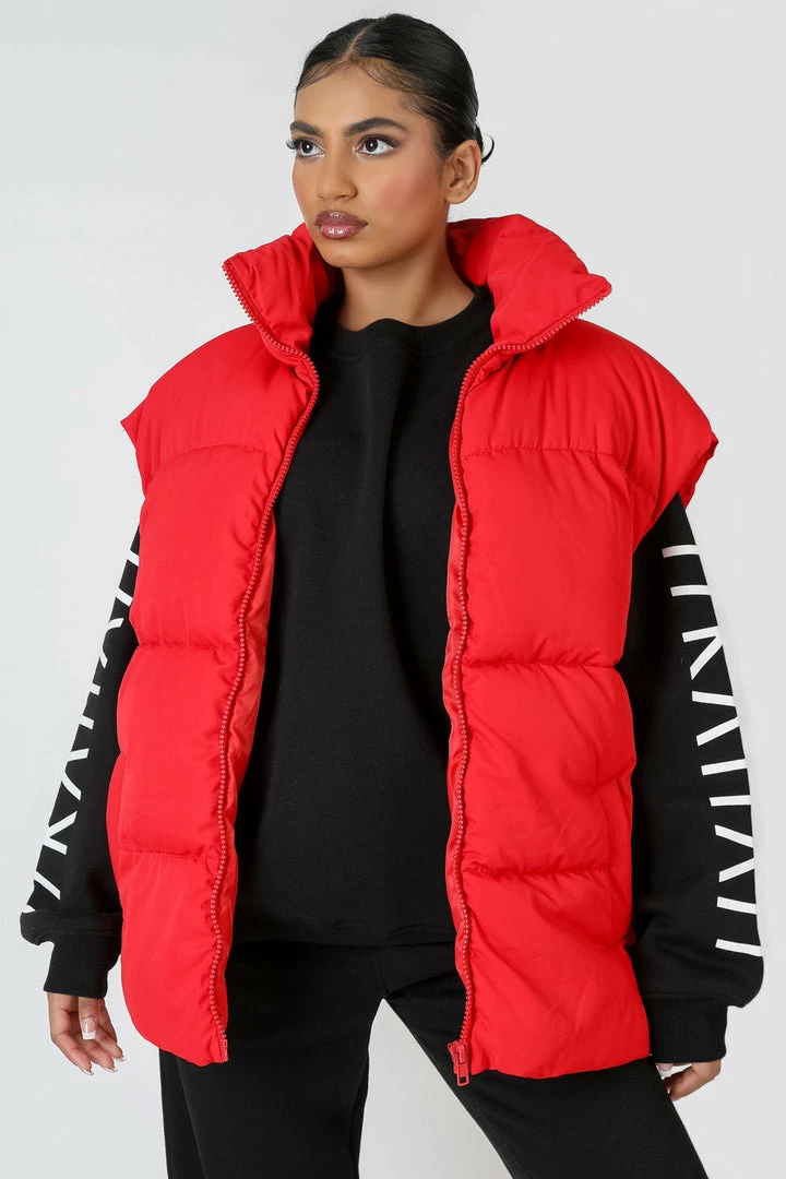 Amp up your new season wardrope with this essential longline, oversized gilet featuring a zip fastening and front pockets in red.