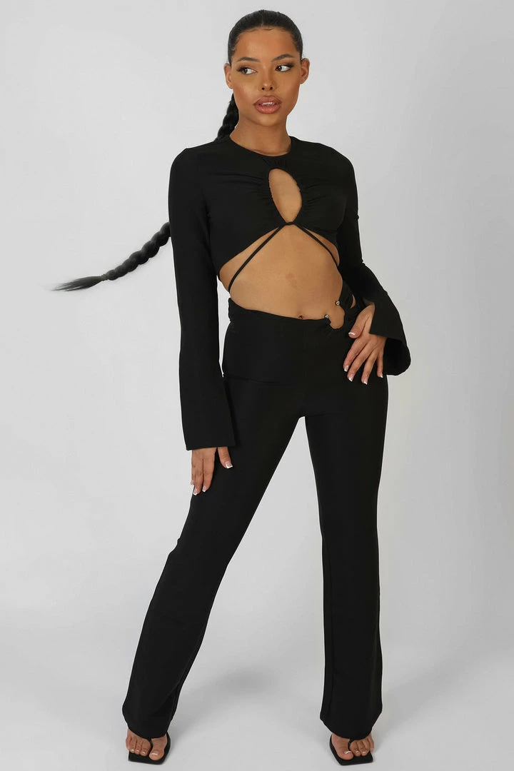 A crop top in black featuring a cut out and strapping detail with long sleeves and splits at the end.