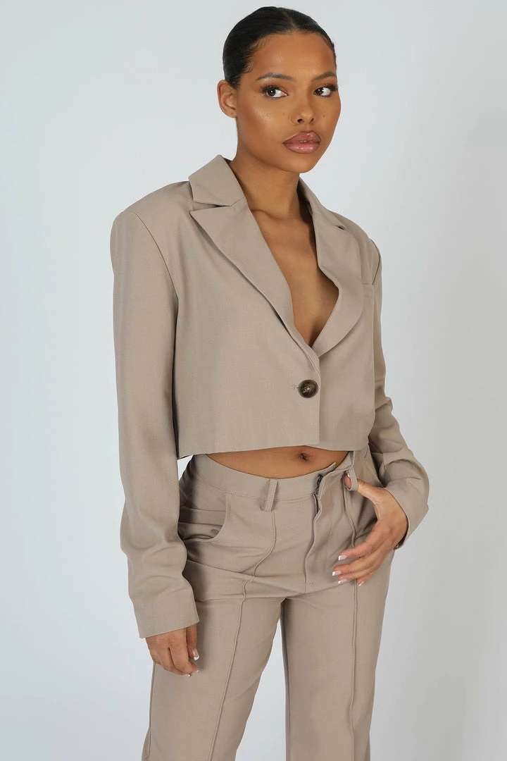 A must have updated style of a cropped boxy fit with shoulder pads and a pocket in stone.