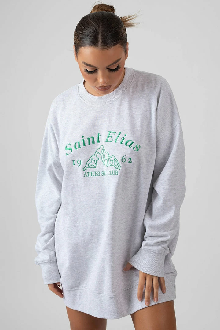 An oversized fit sweater mini dress in grey marl with printing detail on the front.