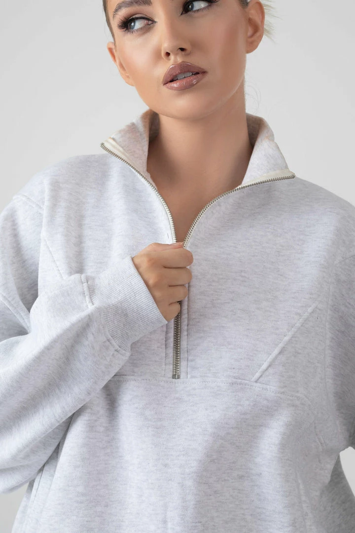 An oversized fit sweatshirt in oatmeal marl featuring a functional half zip and a front pocket