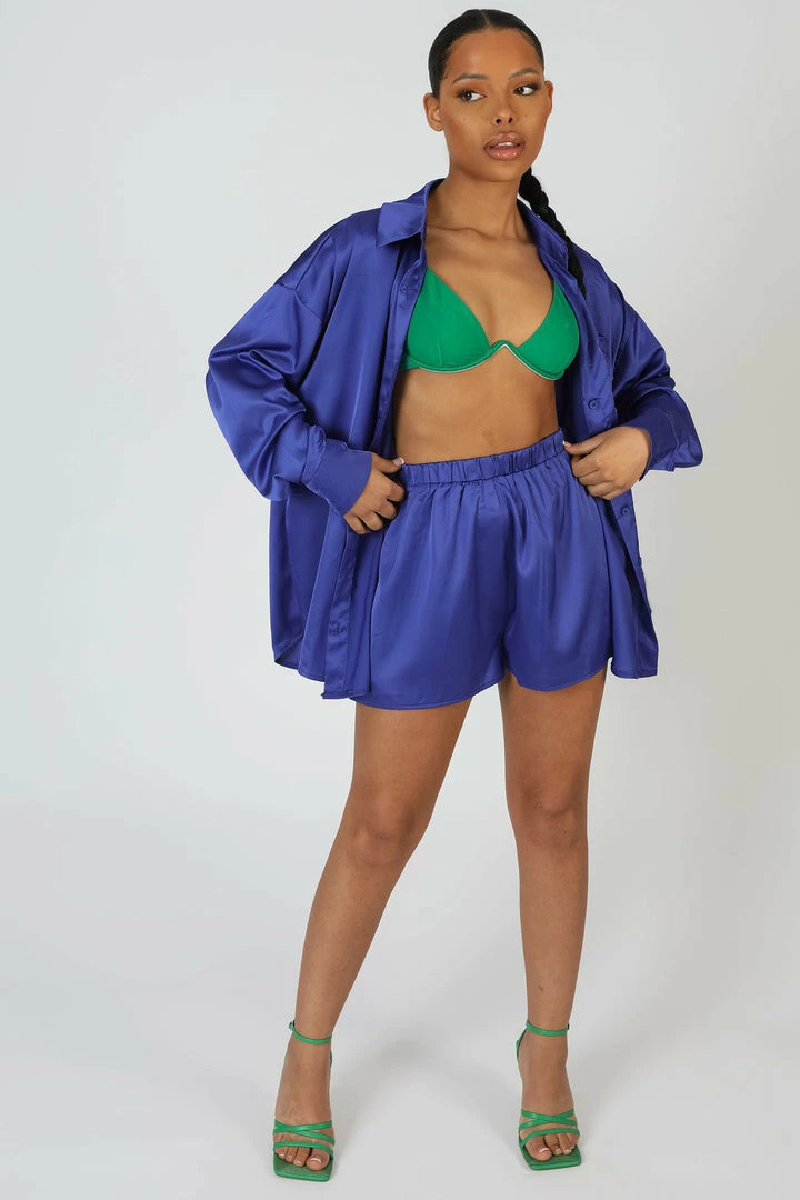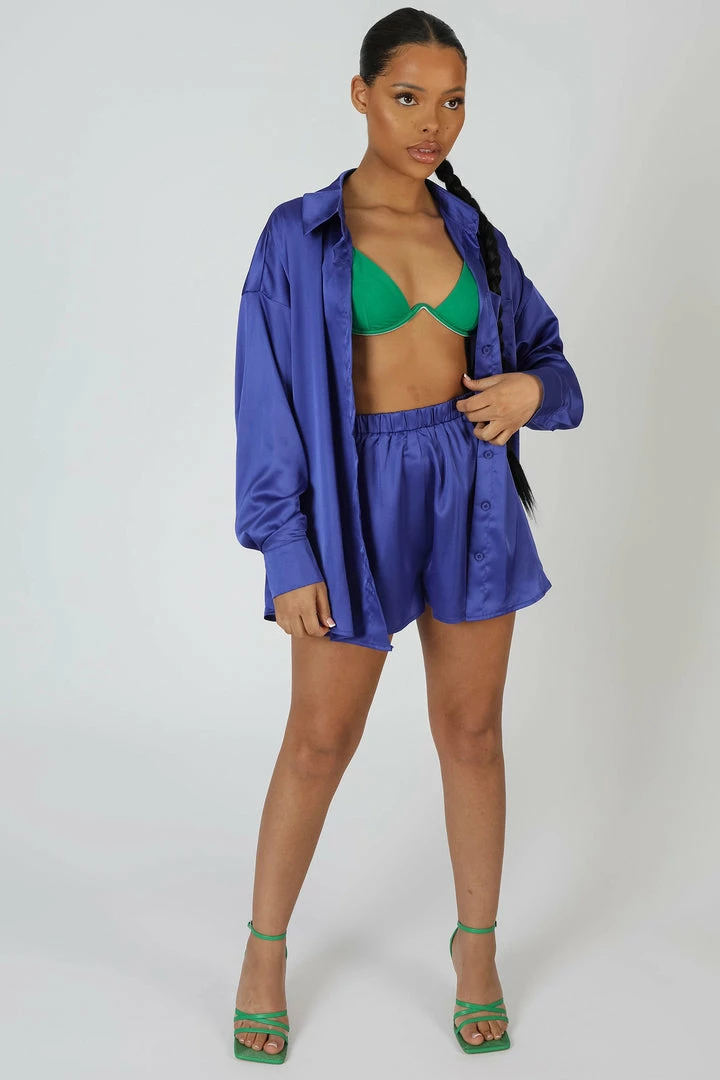 AN OVERSIZED FIT PURPLE SATIN SHIRT WITH DYE TO MATCH BUTTONS AND A FRONT POCKET. PAIR WITH THE PURPLE SATIN JOGGERS FOR THE ULTIMATE SET.