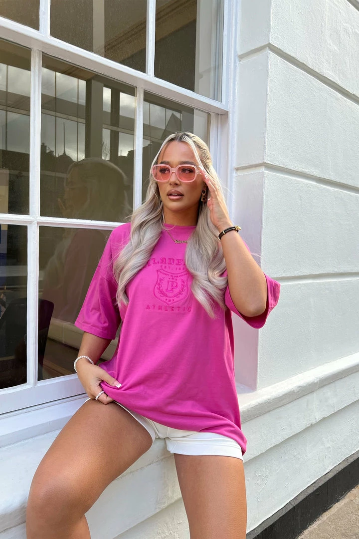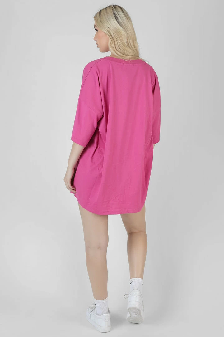 AN OVERSIZED FIT T-SHIRT DRESS IN MAGENTA PINK WITH TONAL EMBROIDERY.