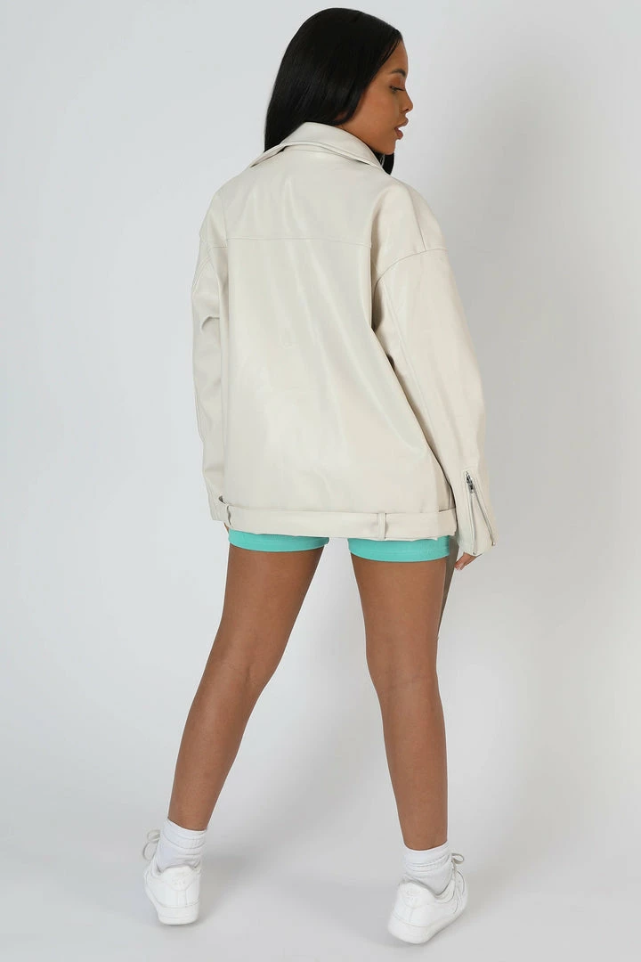 AN OVERSIZED FIT BIKER JACKET IN A STONE WHITE PU WITH SILVER DETAILING.
