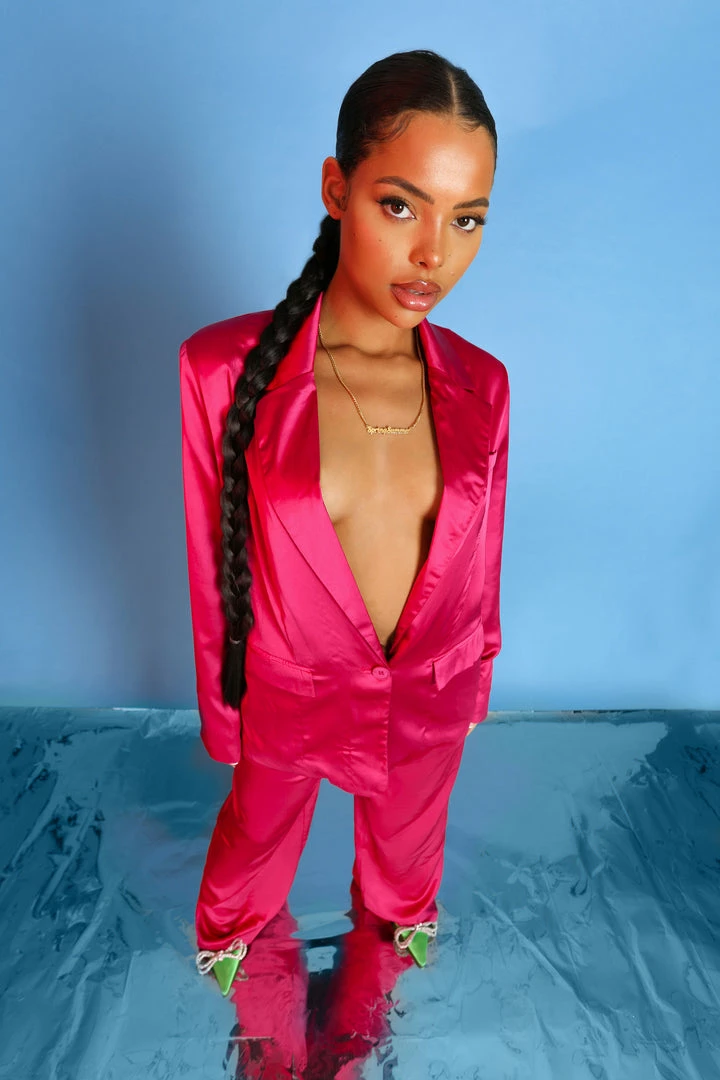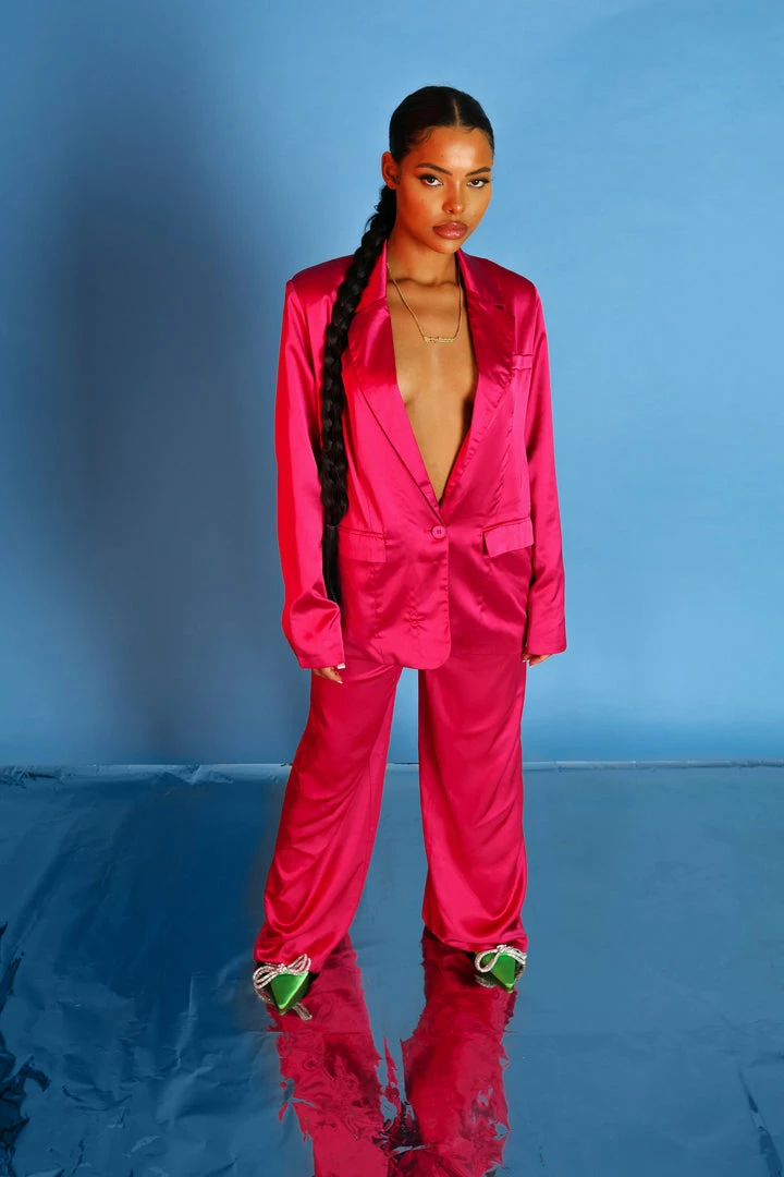 AN OVERSIZED DAD STYLE FIT BLAZER IN PINK SATIN WITH DYE TO MATCH BUTTONS.