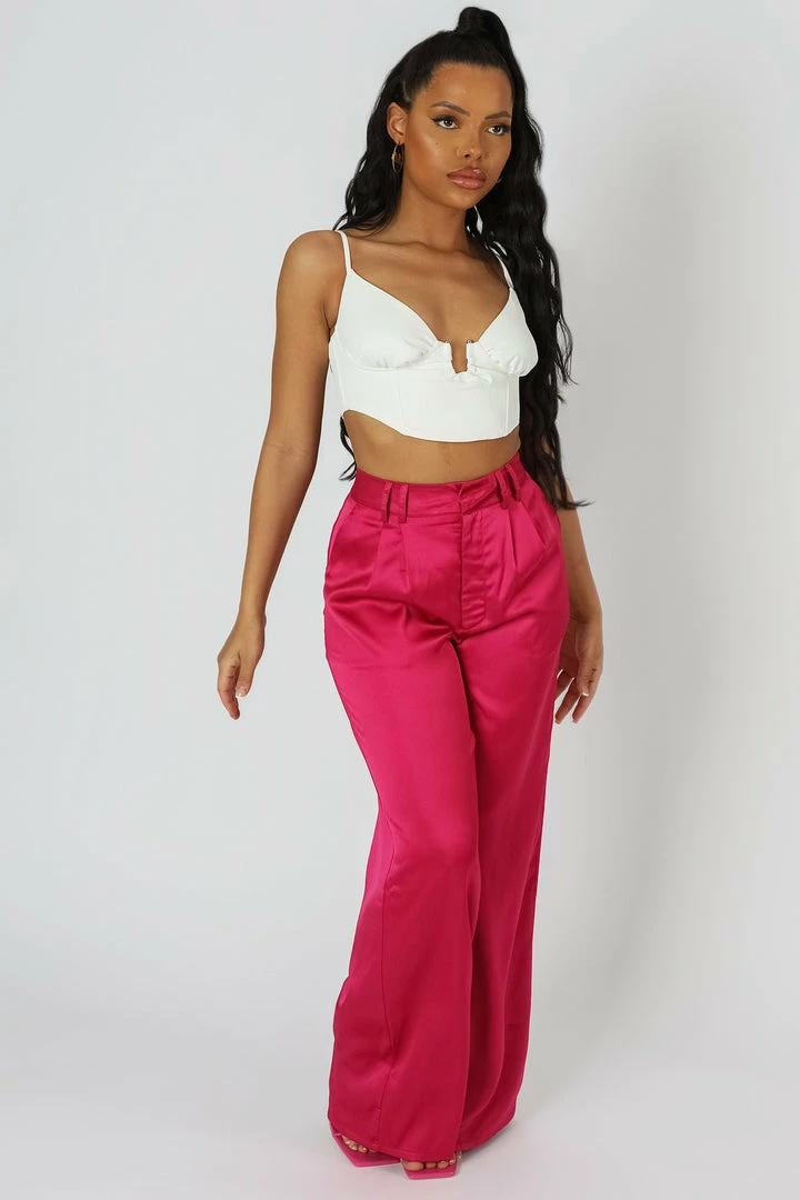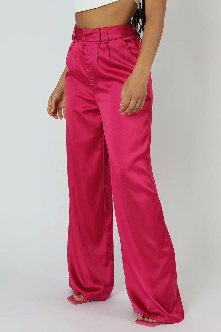 HIGH WAISTED TAILORED TROUSERS IN PINK SATIN FEATURING BELT LOOPS, A CONCEALED BUTTON AND FRONT POCKETS. PAIR WITH THE SATIN DAD BLAZER IN PINK FOR THE ULTIMATE SUIT.