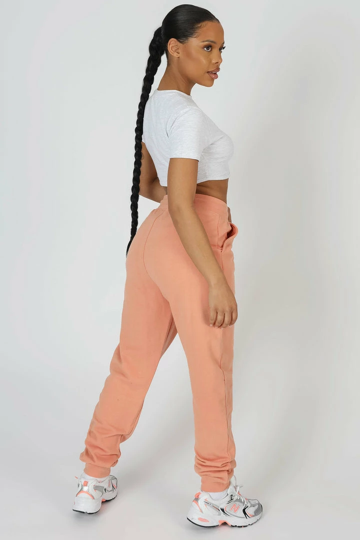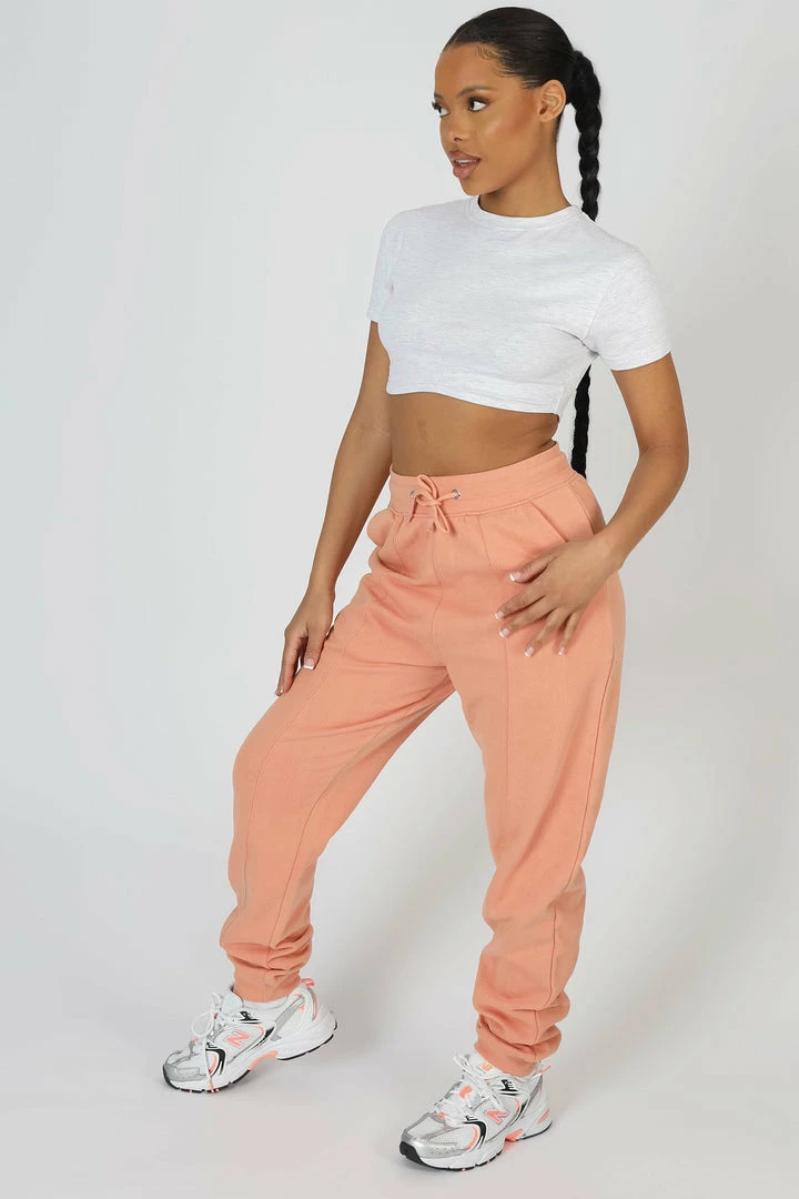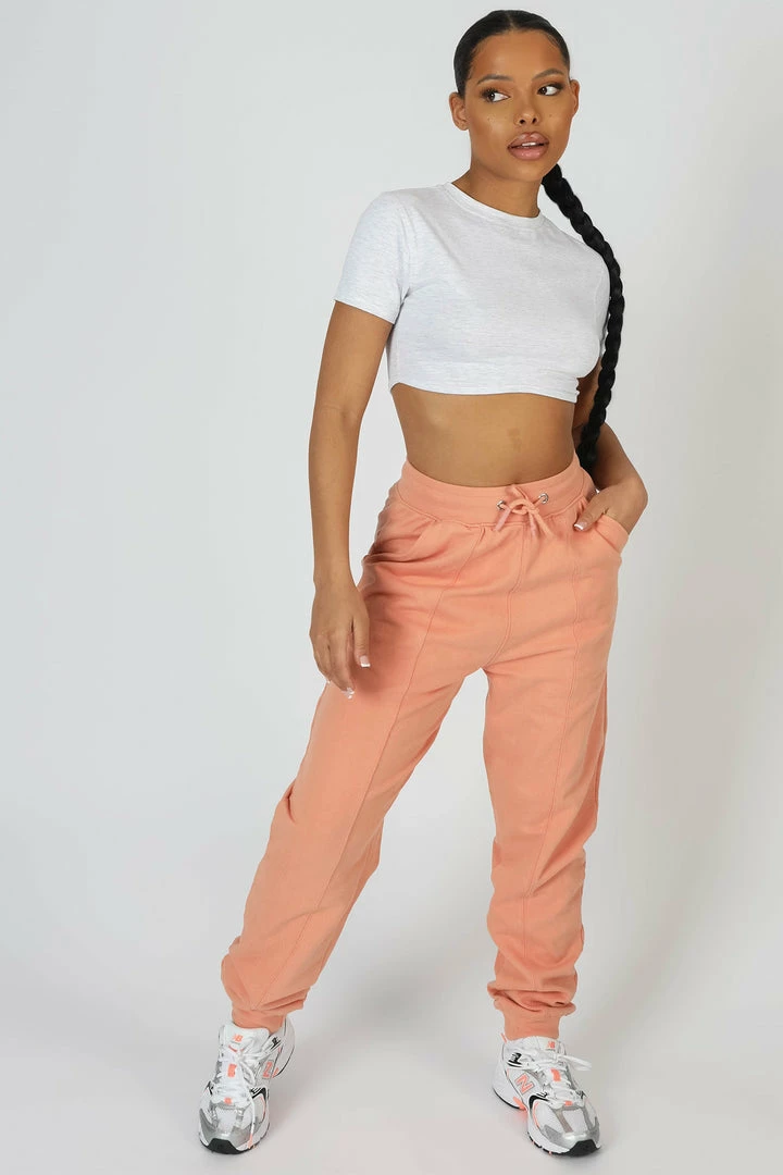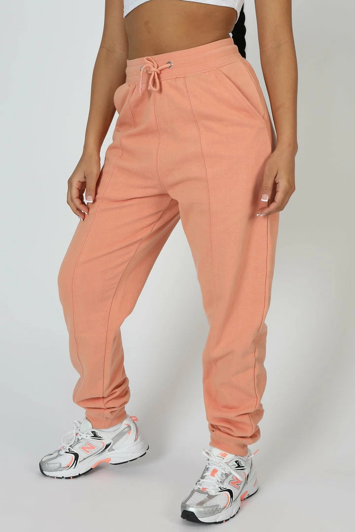 HIGH WAISTED SEAM FRONT DETAILS 90S STYLE JOGGERS WITH FRONT POCKETS AND A DRAWSTRING WAIST IN PEACH. PAIR WITH THE SANTA ROSA GATHERED HEM CROPPED SWEATSHIRT PEACH OR THE PALM BEACH EMBROIDERED RACER CROP TOP IN PEACH FOR THE ULTIMATE SET.