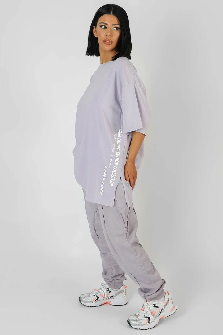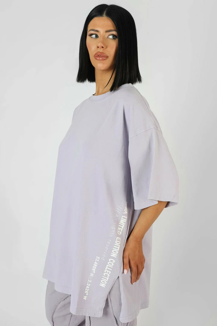 An oversized t-shirt in lilac with short sleeves featuring printed detailing down the side.