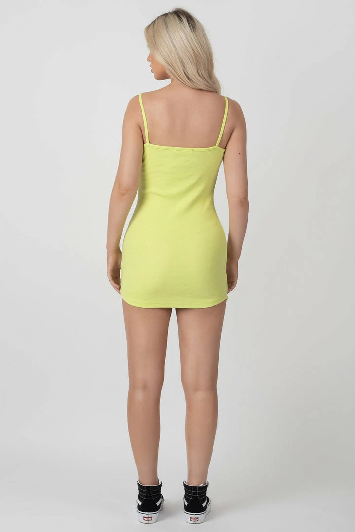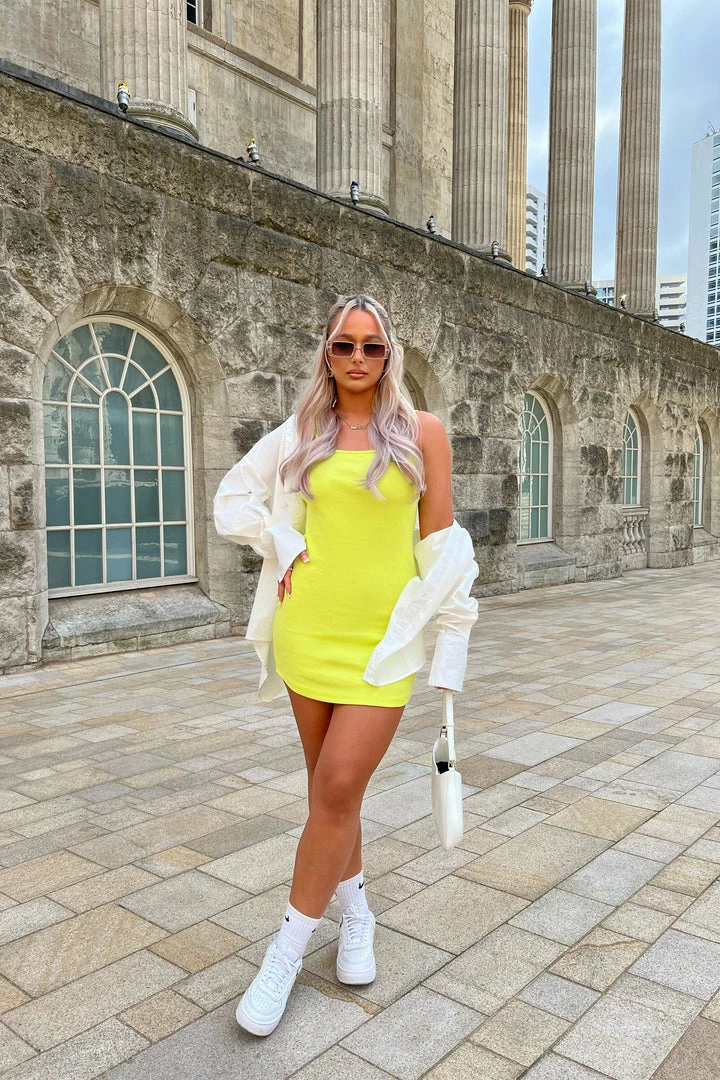 A bodycon mini dress with thin straps and a flattering curved hem in lime