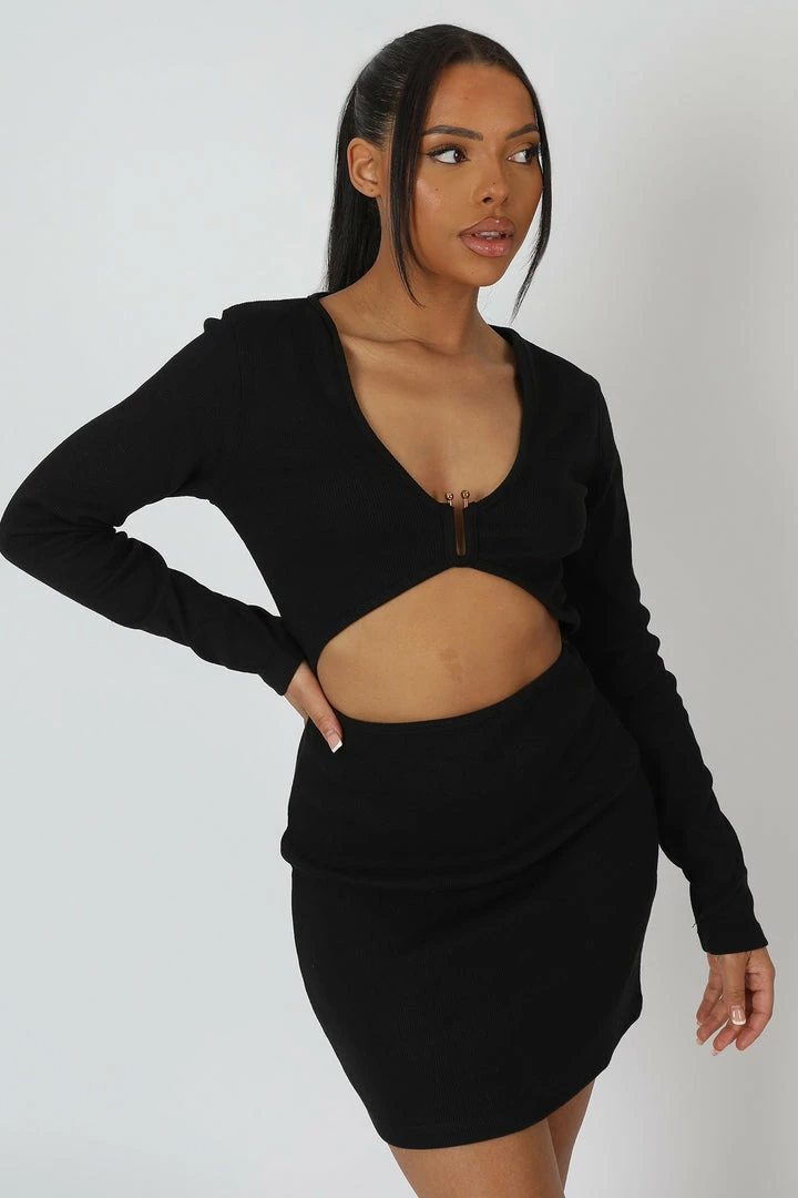 A MINI DRESS IN BLACK WITH A U-BAR TRIM DETAILING.