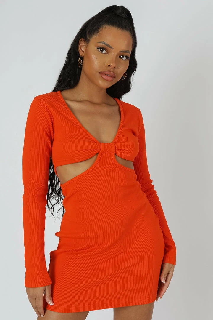 A RIBBED BODYCON MINI DRESS IN ORANGE WITH LONG SLEEVES AND WAIST CUT OUTS