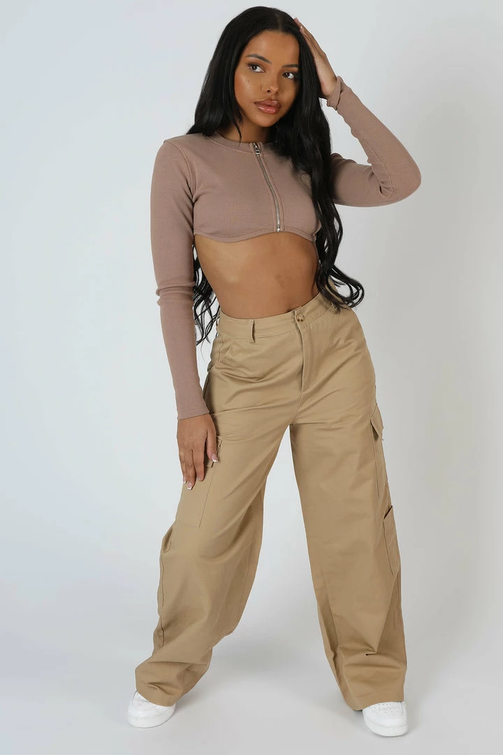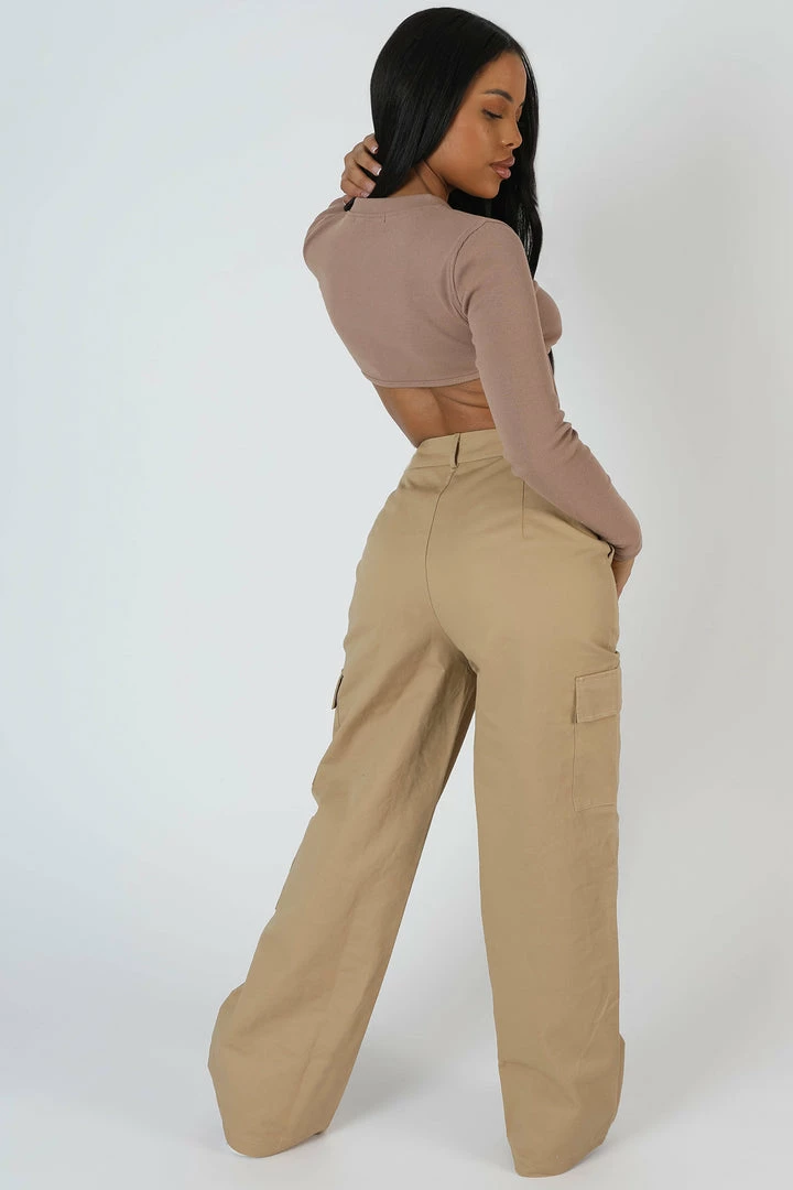 A HIGH WAISTED CARGO TROUSER WITH A SLIGHTY WIDE LEG IN SAND NUDE BROWN FEATURING CARGO STYLE POCKETS.
