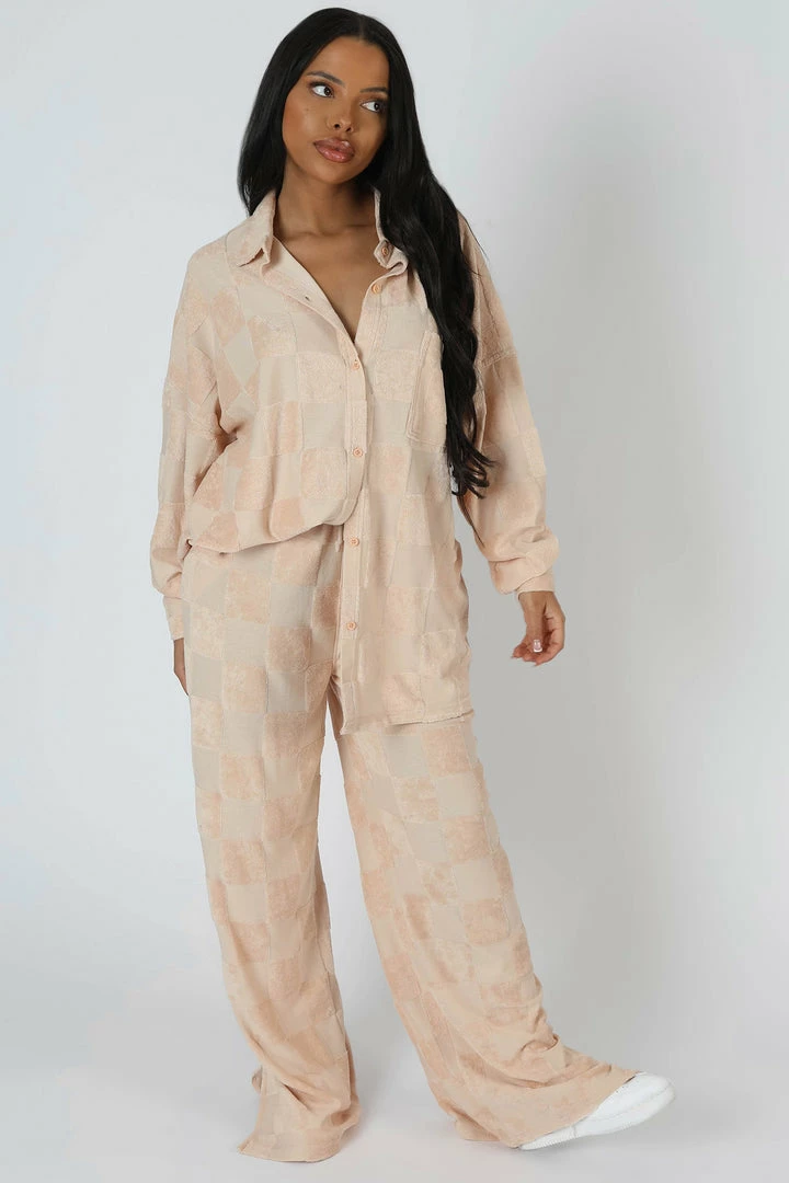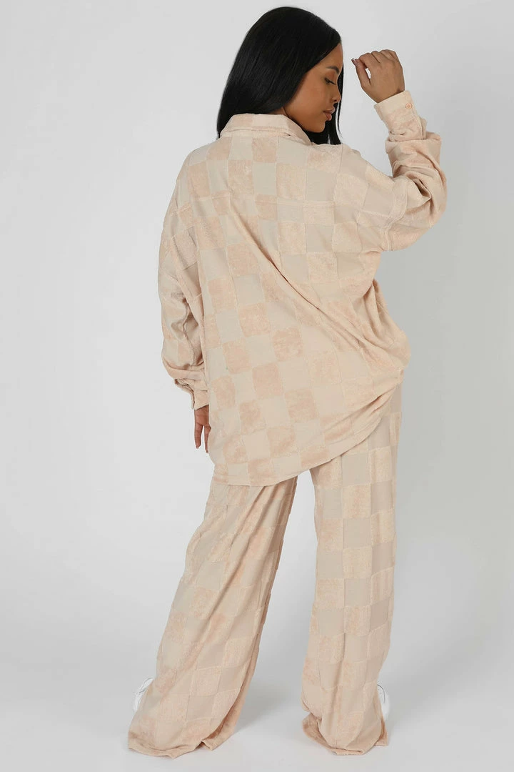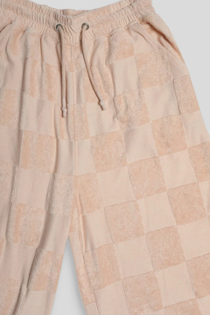 OVERSIZED FIT HIGH WAISTED DRAWSTRING STRAIGHT WIDE LEG JOGGER TROUSERS IN A SAND TONAL CHECKERBOARD TOWELLING PATTERN.