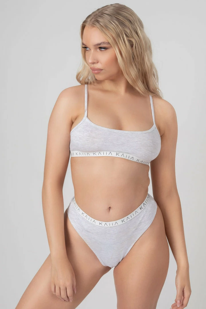 A bralet in grey with thin straps, a square neck and elastic round the hem.
