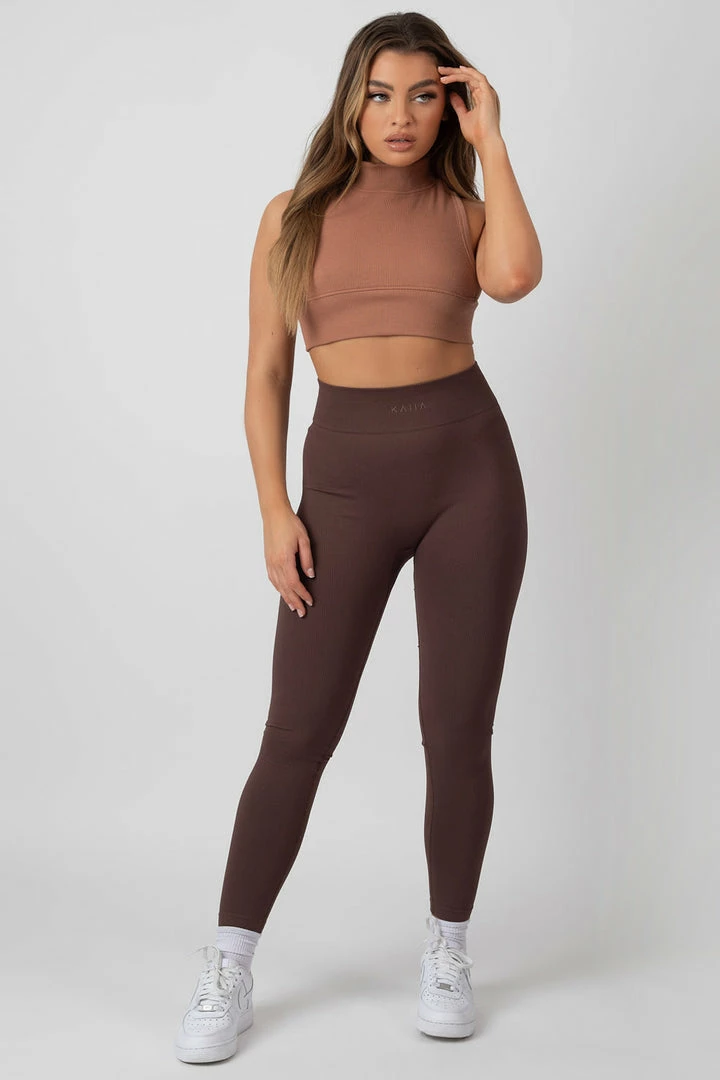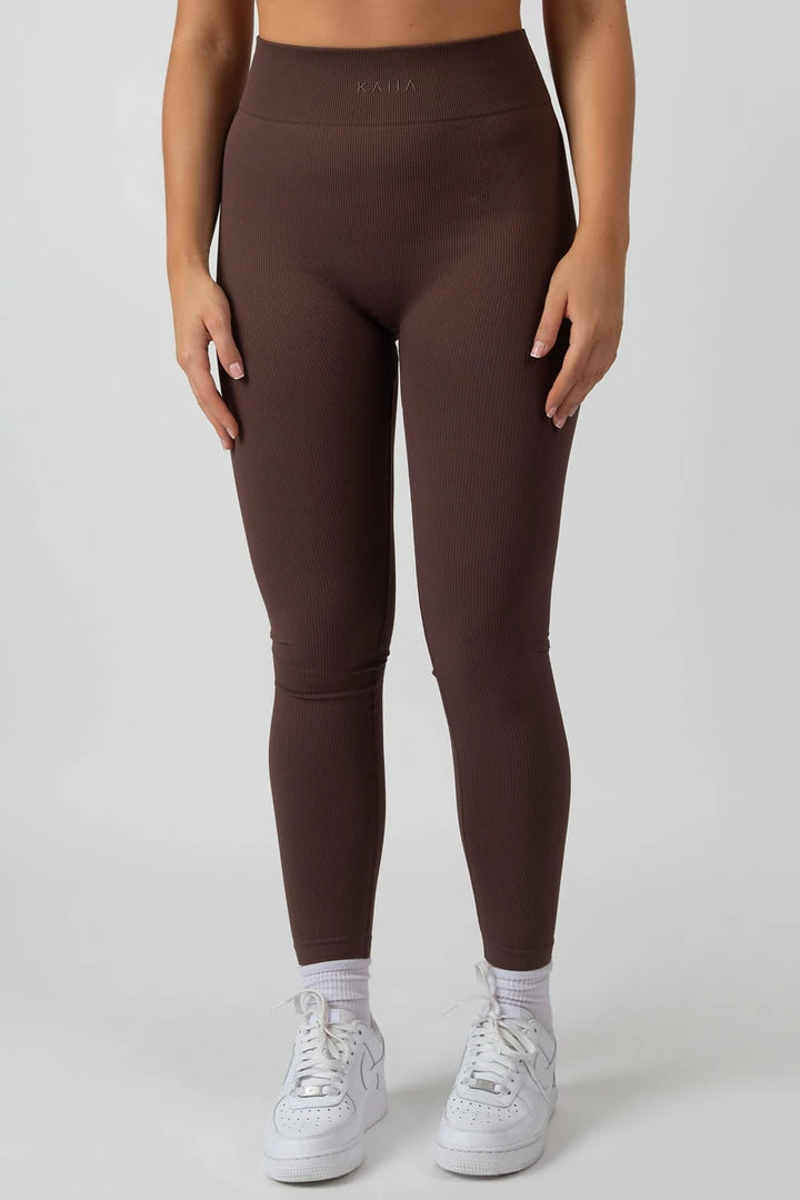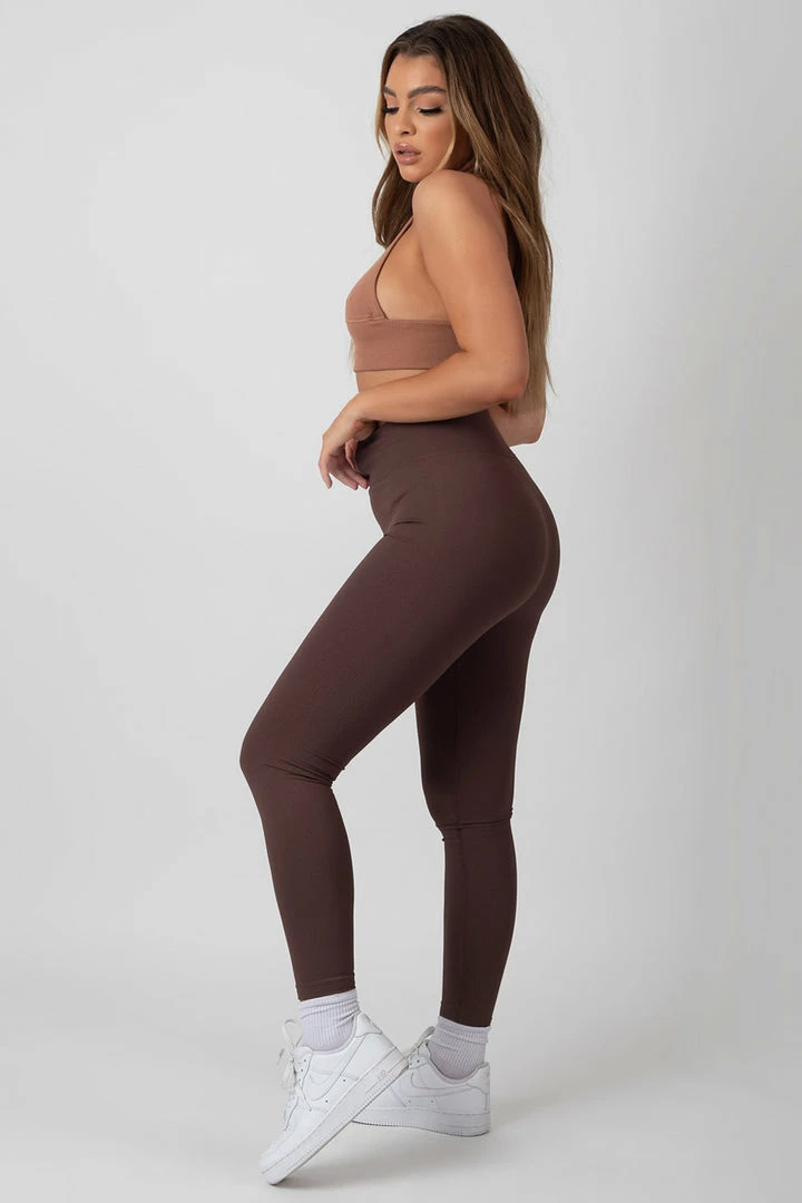 Seamless ribbed leggings in chocolate with our logo detail on the front.