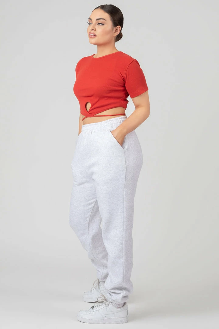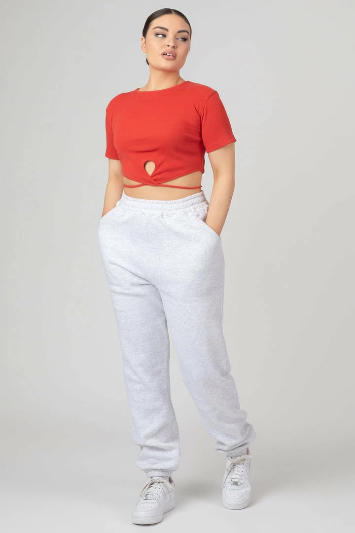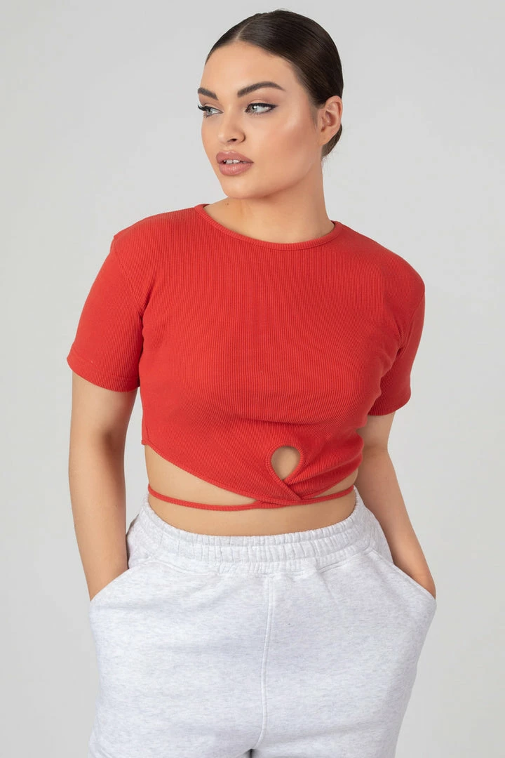 A long sleeve wrap crop top with a keyhole detail and waist straps