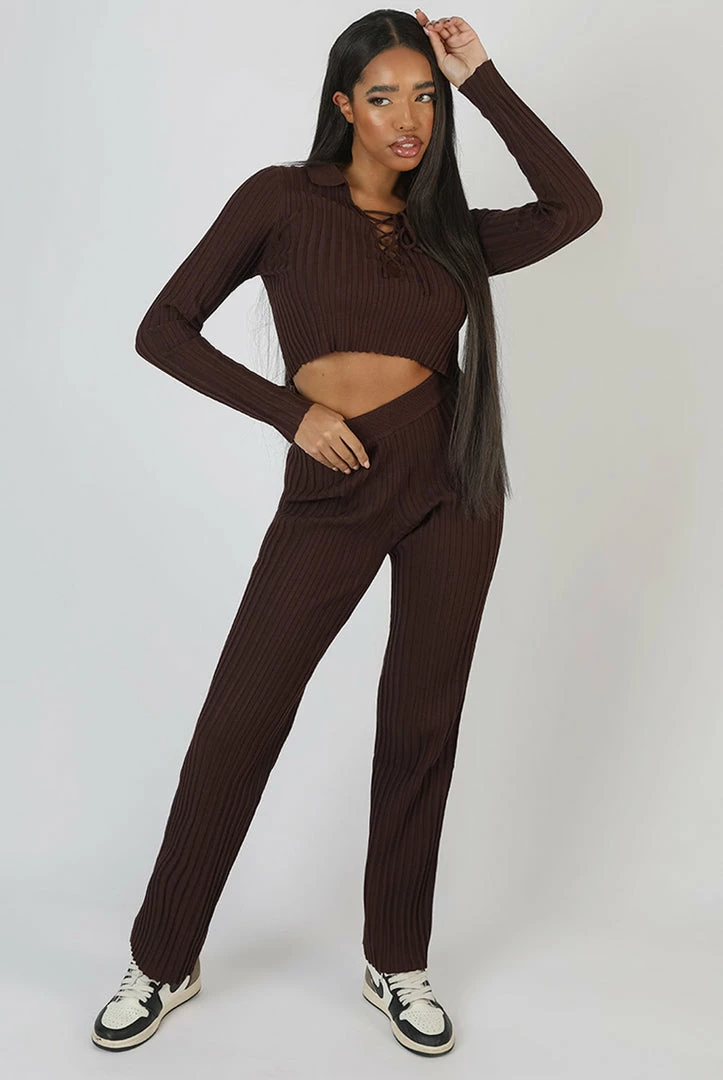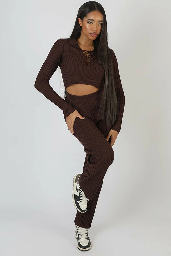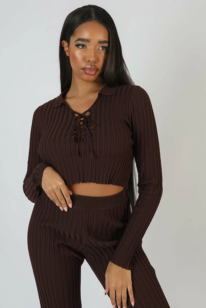 A ribbed knitted long sleeve crop top with a lace up detail on the front in chocolate