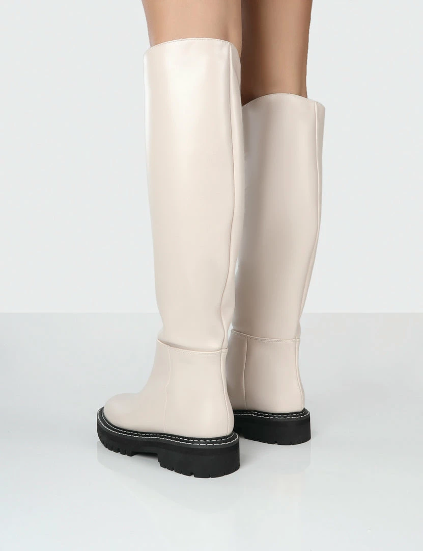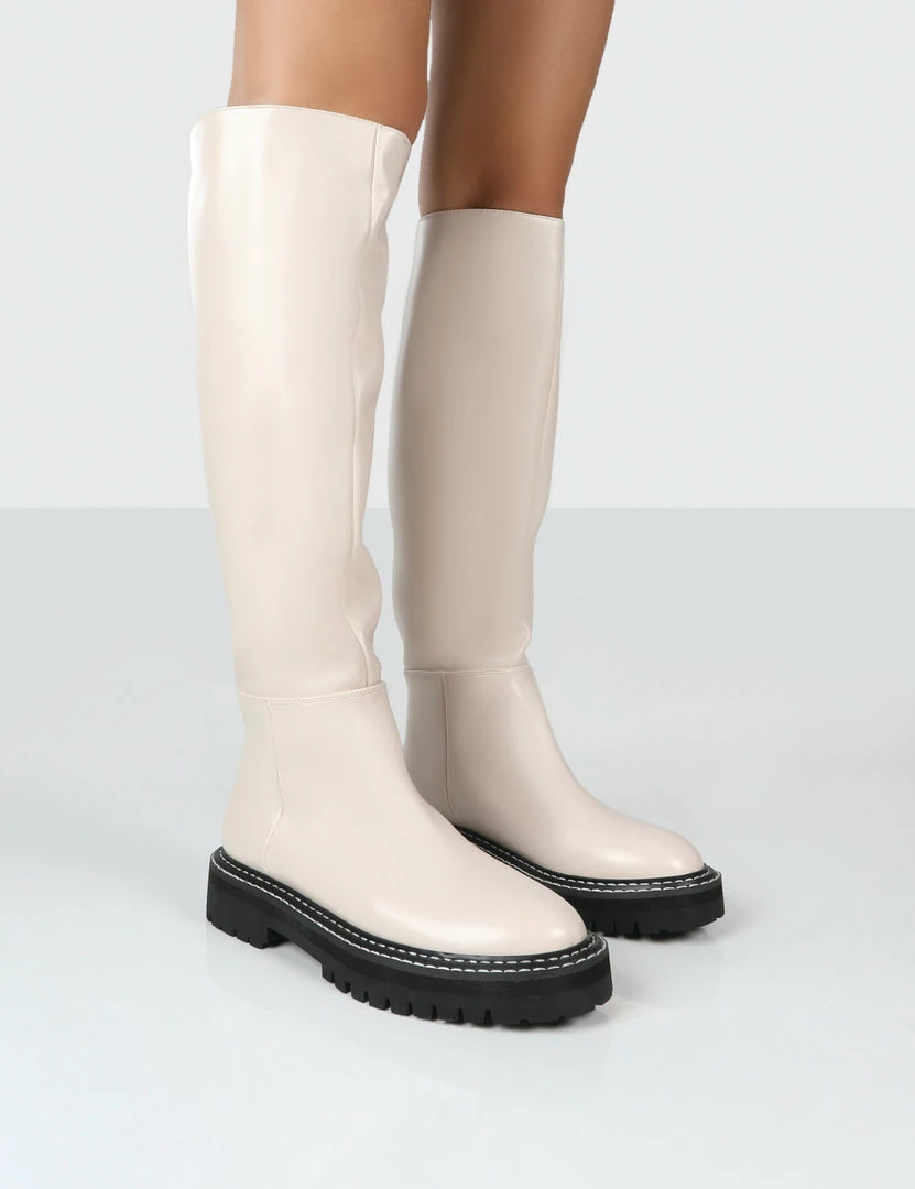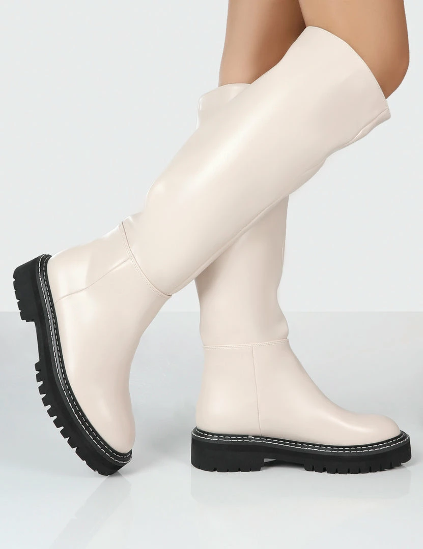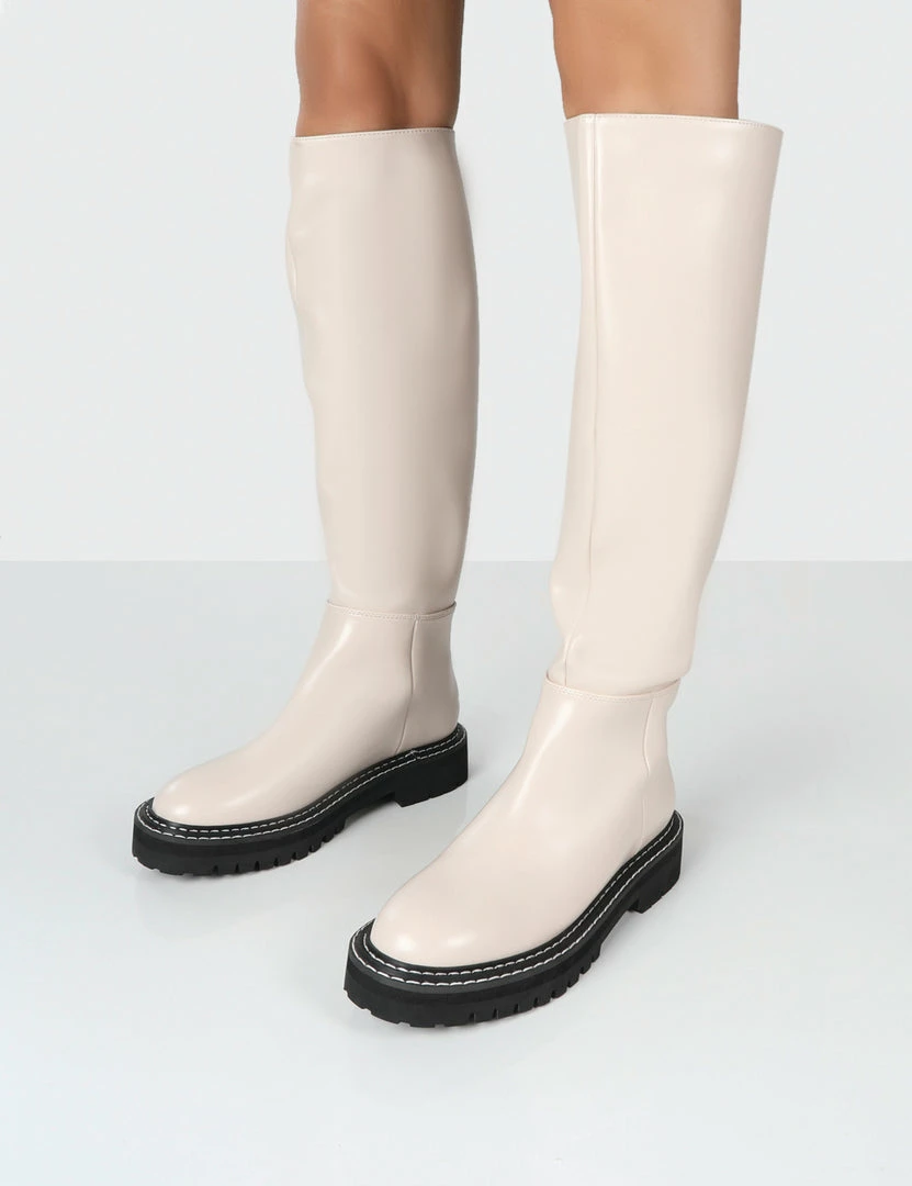 Dana features stitching detail with a block sole. Pair these knee high boots with your off-duty pieces to complete your look.