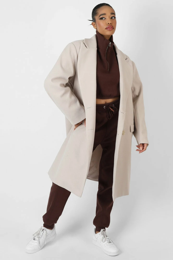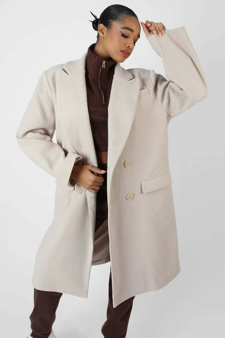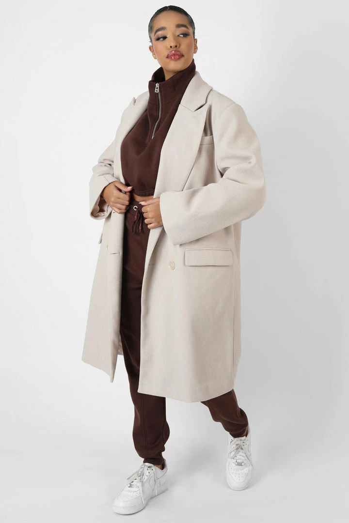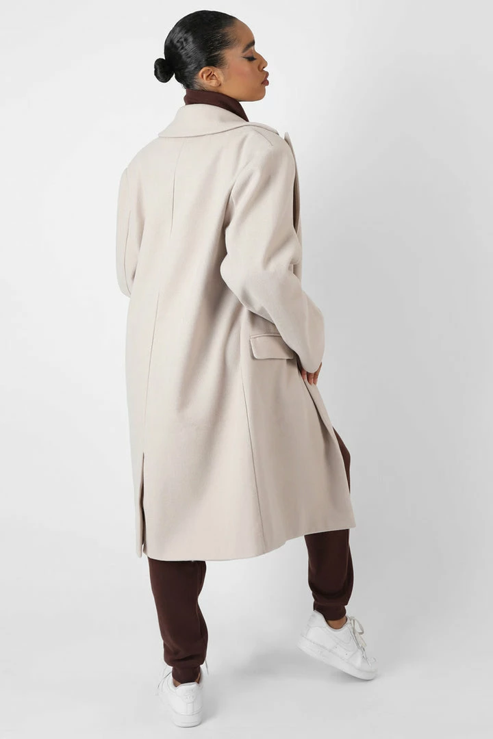 AN OVERSIZED FIT longline oversized fit DOUBLE BREASTED wool coat in stone featuring front pockets.Â