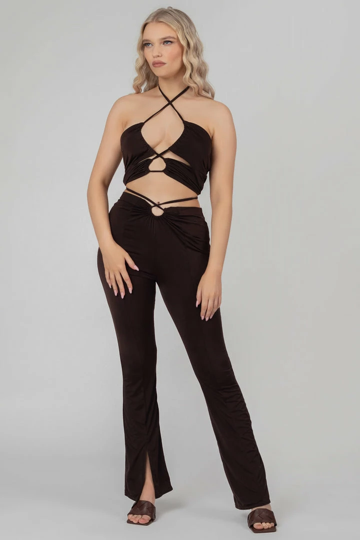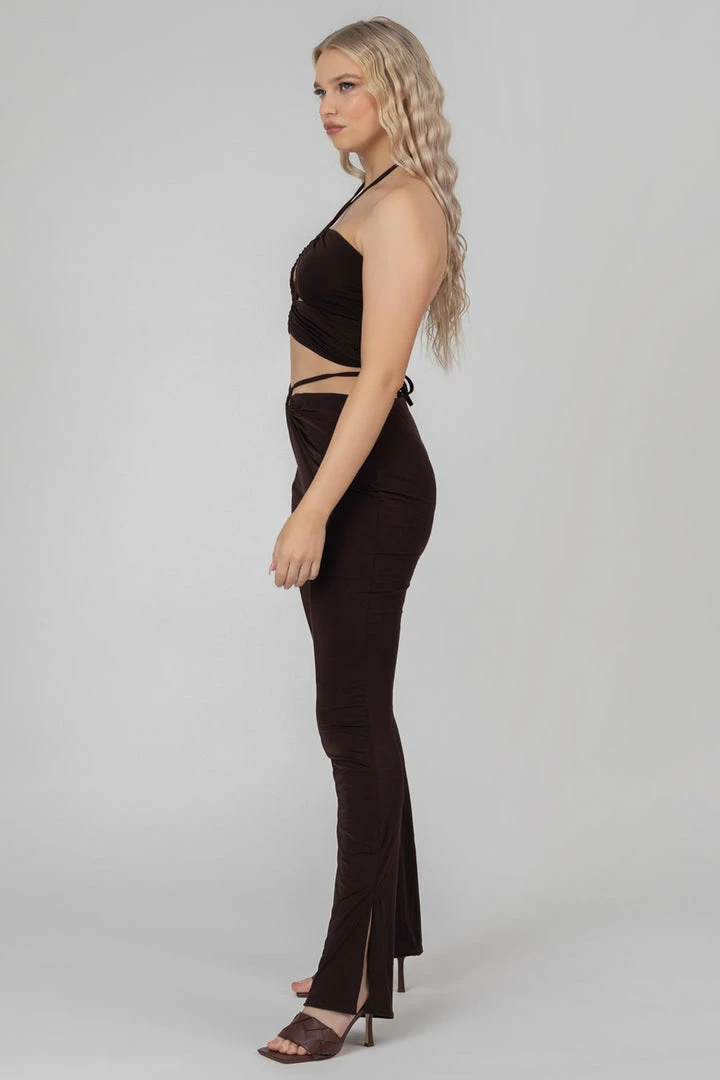 Give your look a seriously chic look with these split hem trousers. Featuring a looped detail high waist and flattering ruching with split hems in chocolate.