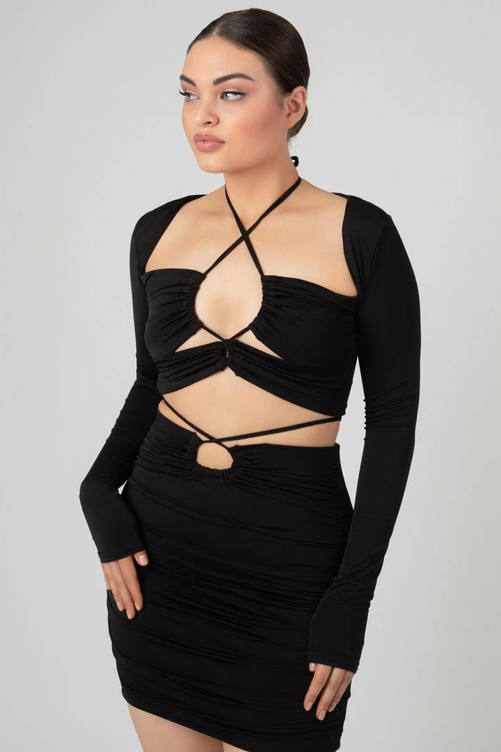 Switch up your new season look with this crop top. Featuring a cropped cut out design with flattering ruching and long sleeves in classic black.