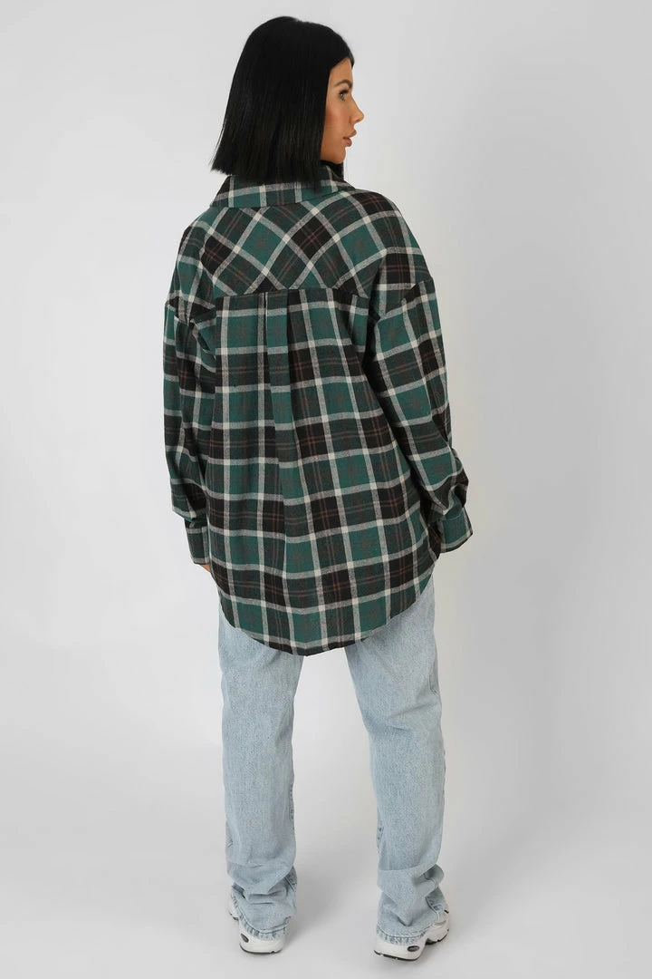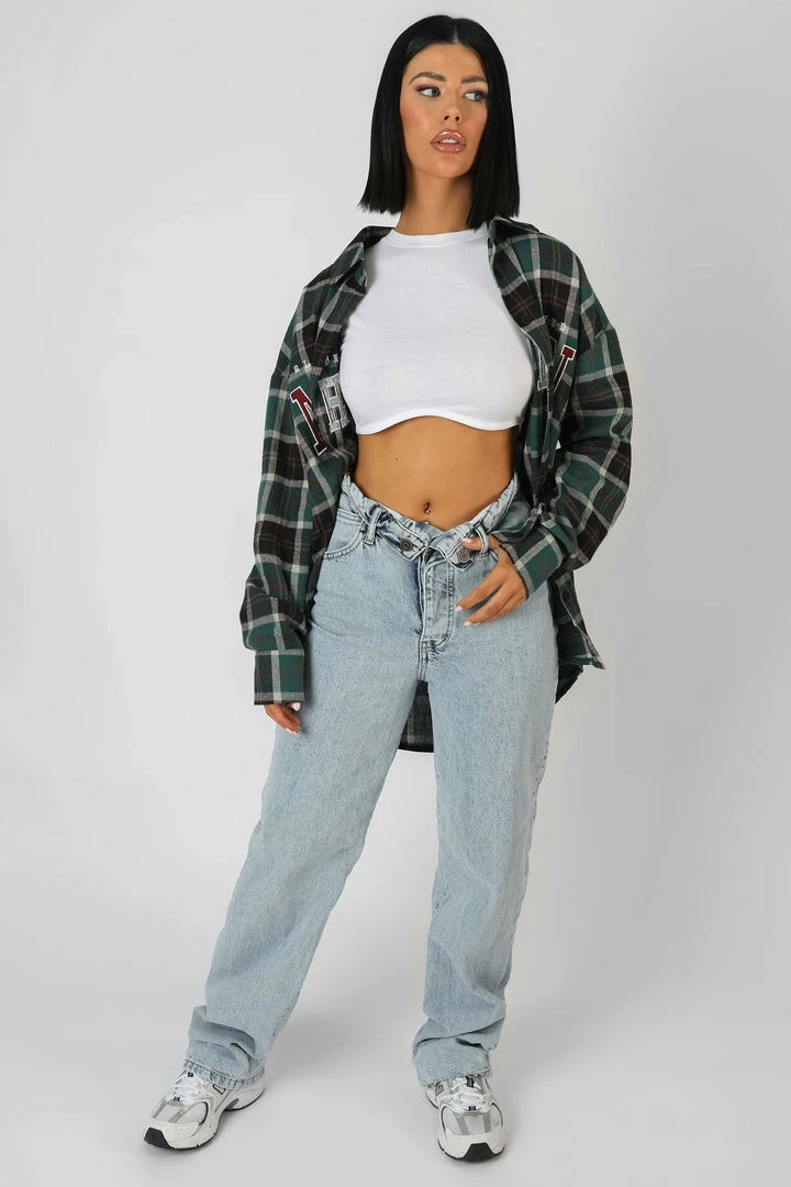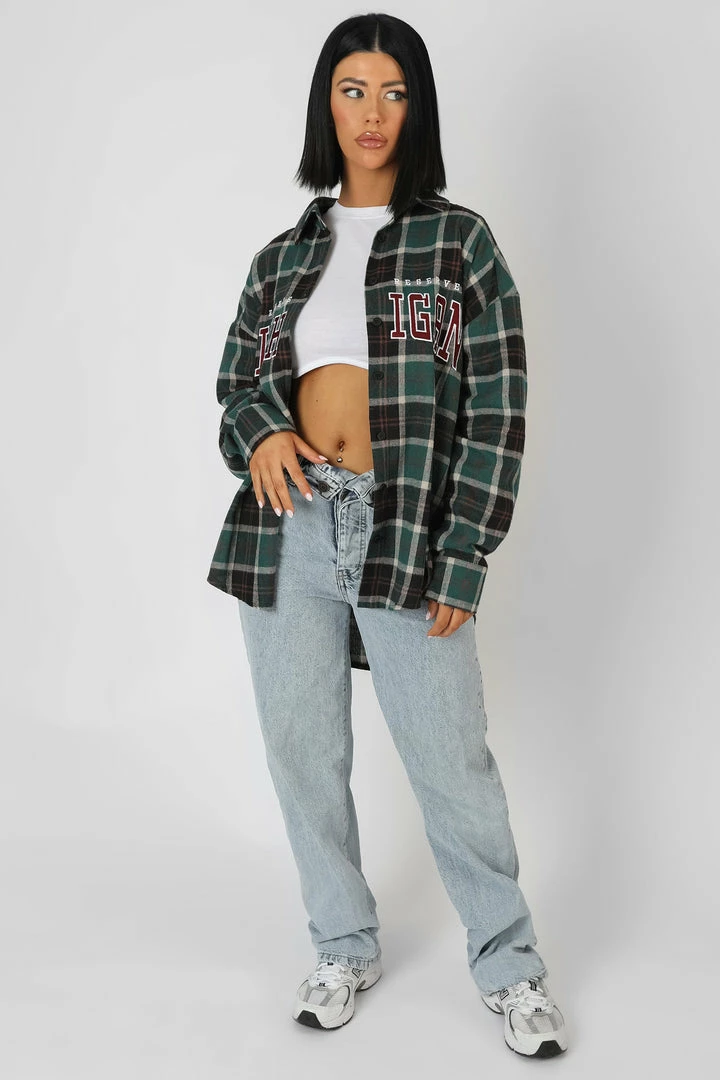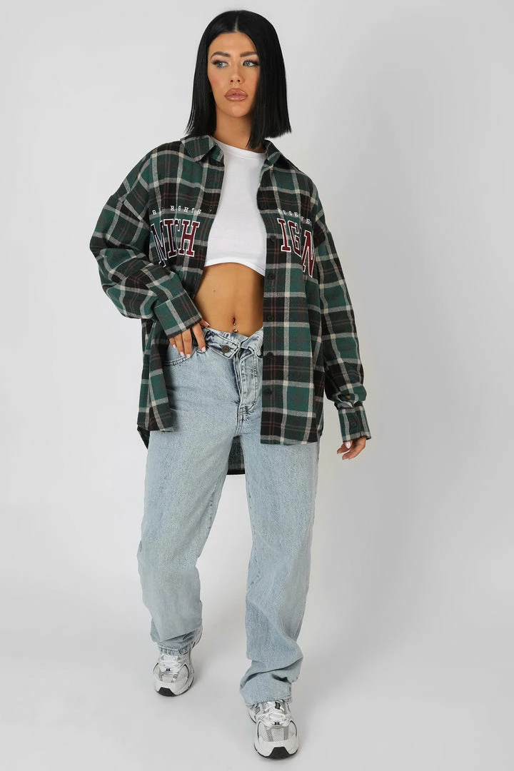 AN OVERSIZED FIT CHECK SHIRT IN FOREST GREEN WITH ‘MICHIGAN’ PRINTED ON THE FRONT.