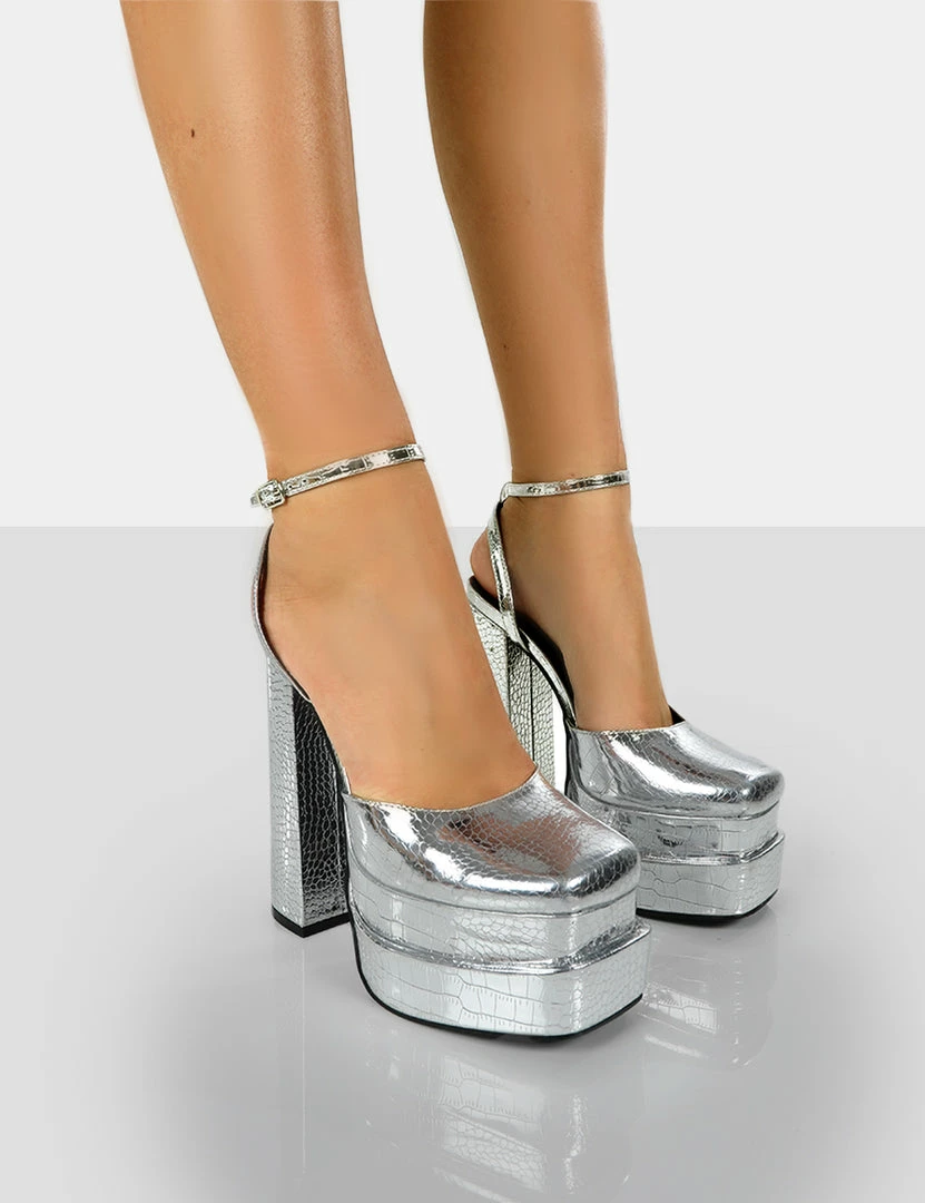 Public Desire UK Moonchild Silver Croc Closed Toe Statement Platform Block Heels NEW IN