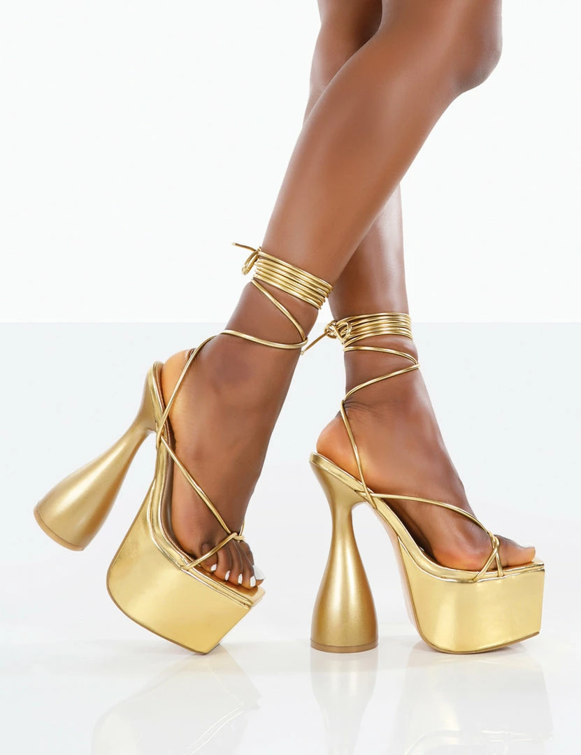 Girls, it’s time to step up your weekend heel game and we’ve heard you’ve been searching for a wider fit? Look no further, the search is finally over boo! Meet Story, a gorgeous pair of gold lace up cylinder platform heels guaranteed to make you the star of the show. Featuring a super cool cylinder heel and platform sole, these wide fit heels are perfect all year round and will take your party season looks to the next level. Lace her up or down for two completely different looks, what’s not to love? Lace up heels and platform heels are a super hot trend that every girl needs to try!