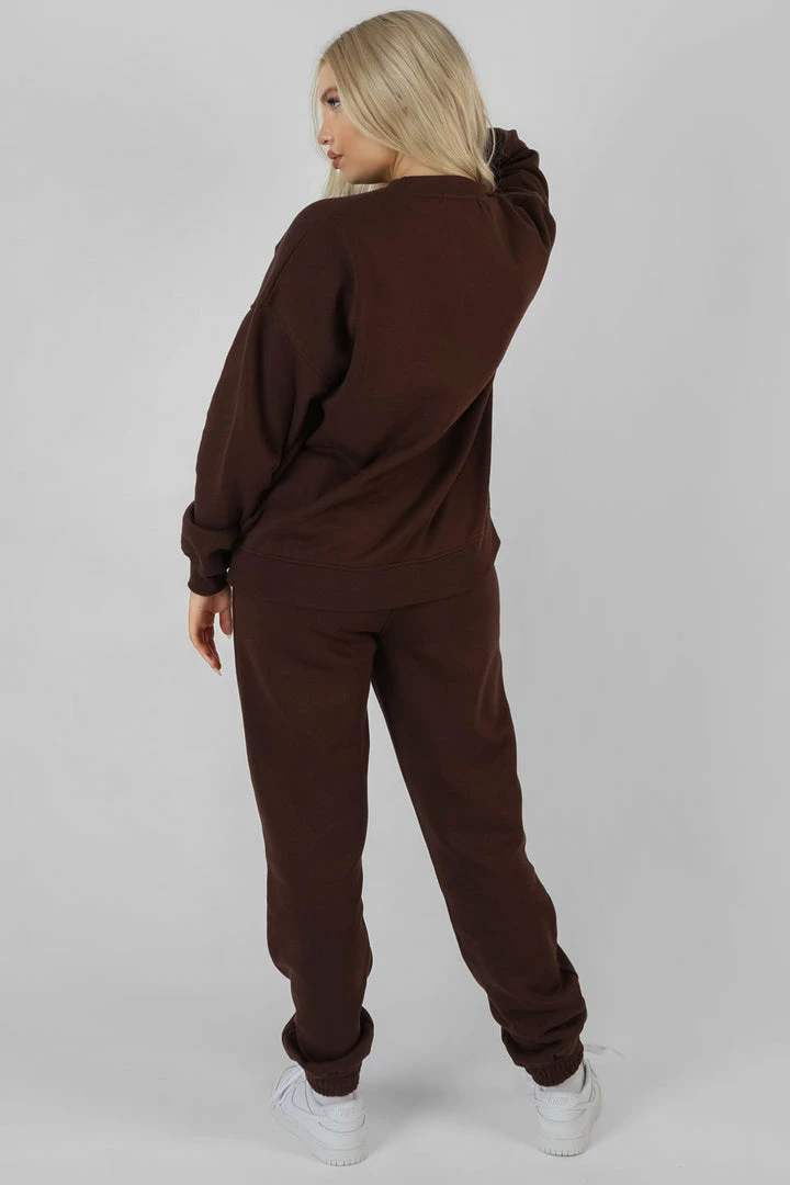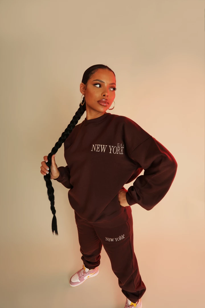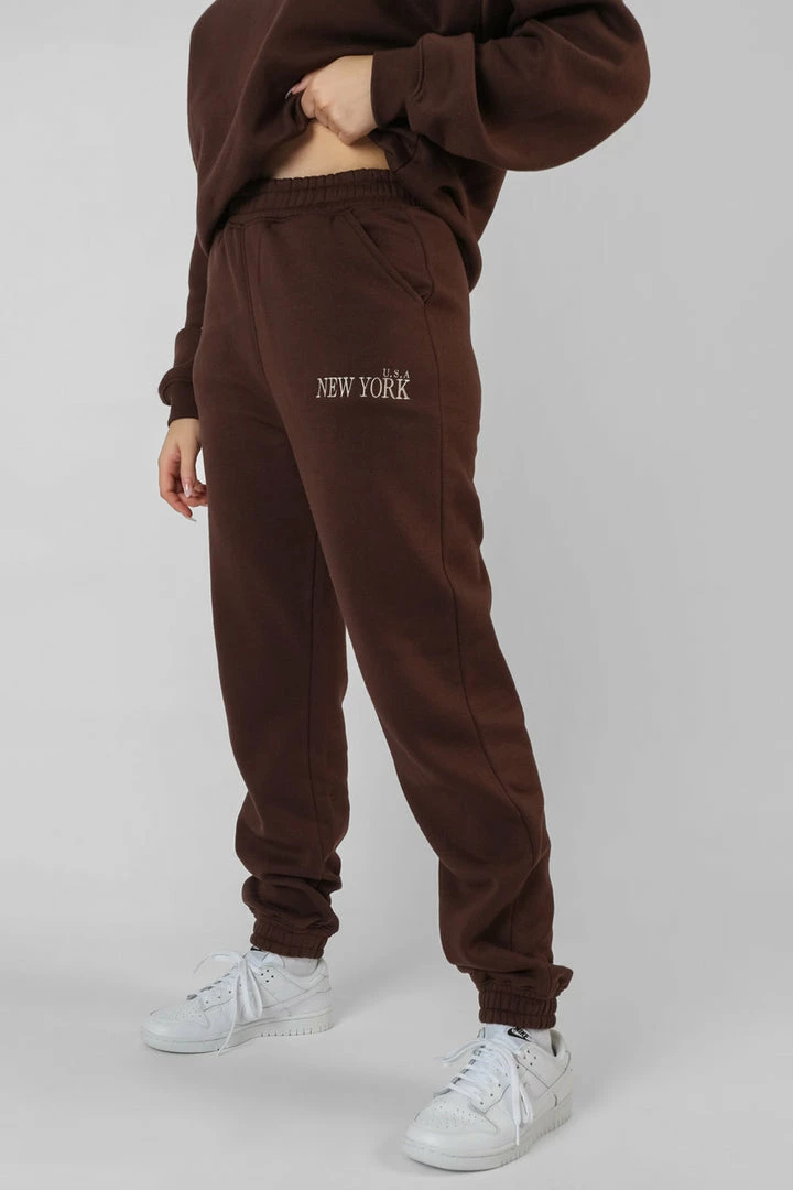 OVERSIZED FIT HIGH WAISTED 90S STYLE JOGGERS IN CHOCOLATE WITH NEW YORK DETAILING. PAIR WITH THE NEW YORK OVERSIZED SWEATSHIRT IN CHOCOLATE FOR THE ULTIMATE SET.