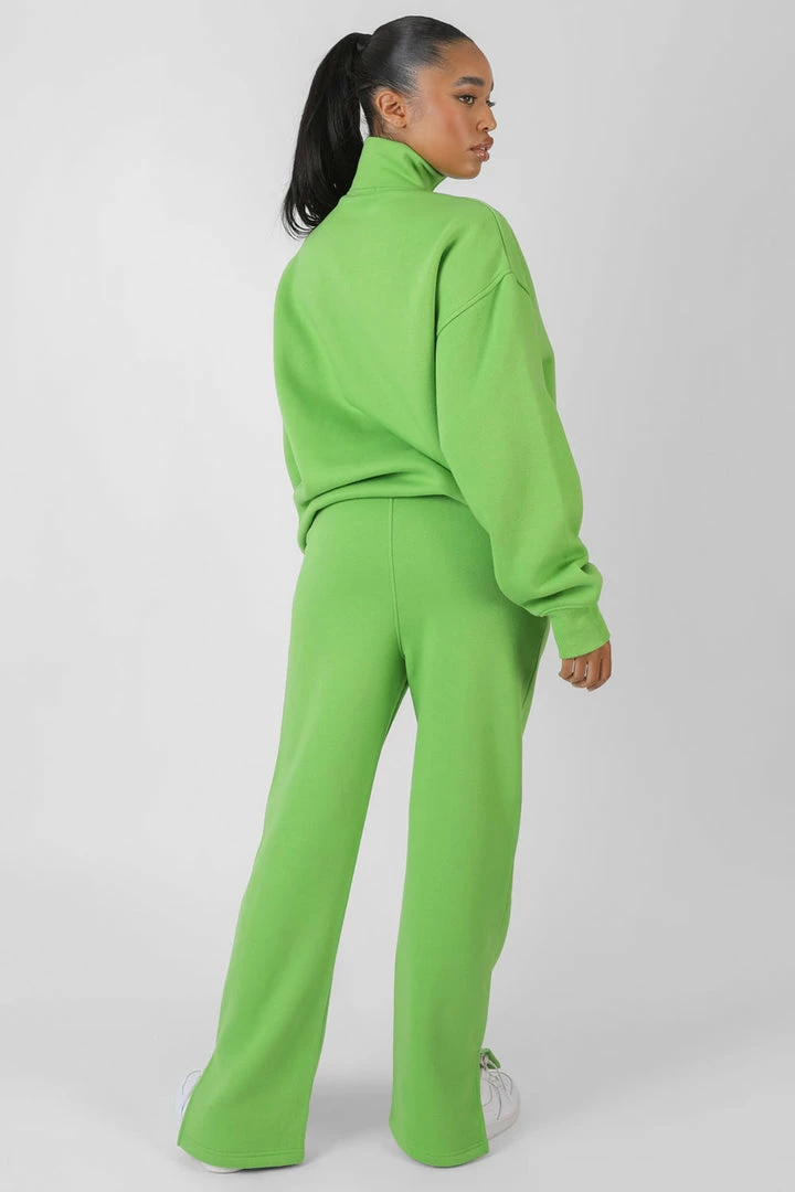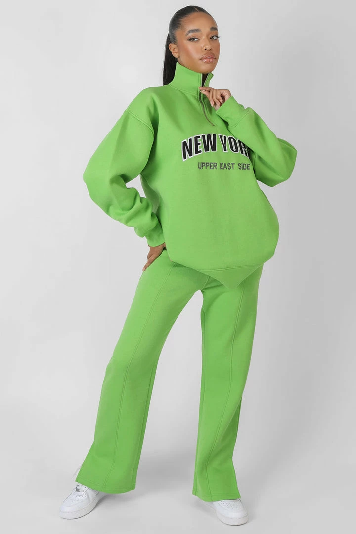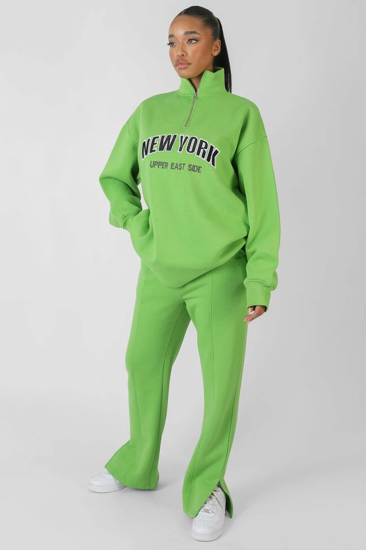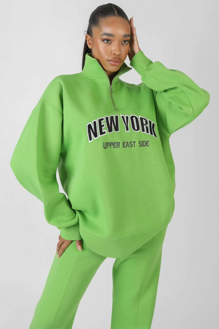 An oversized sweater in green with a half zip and ‘NEW YORK’ embroidered on the front.
