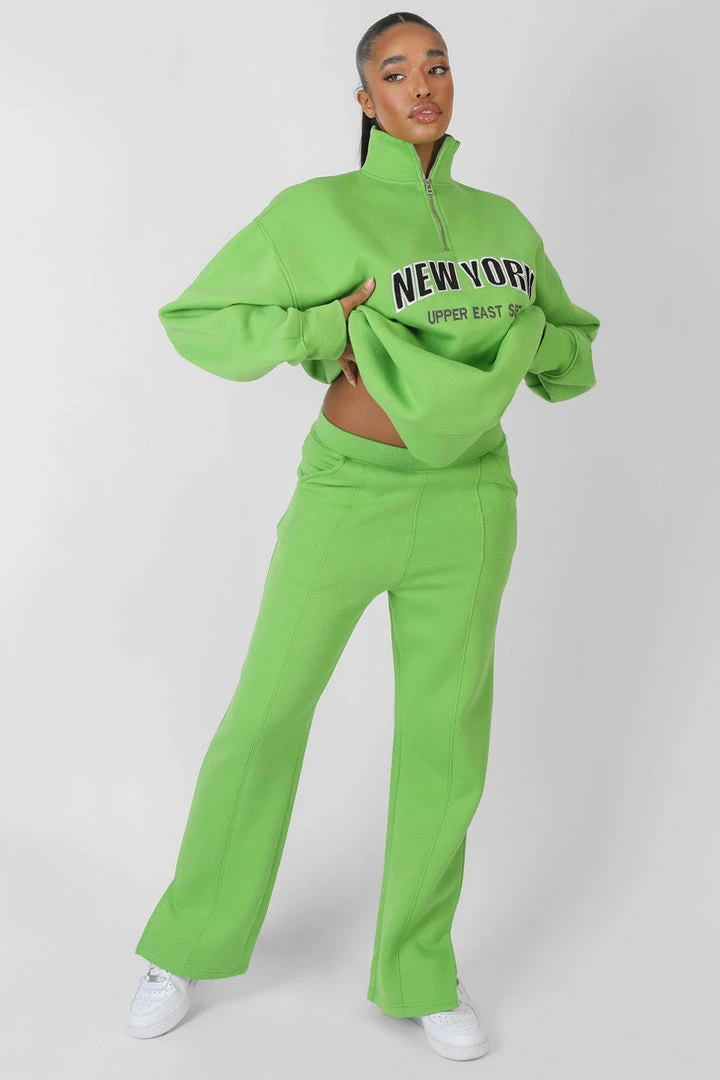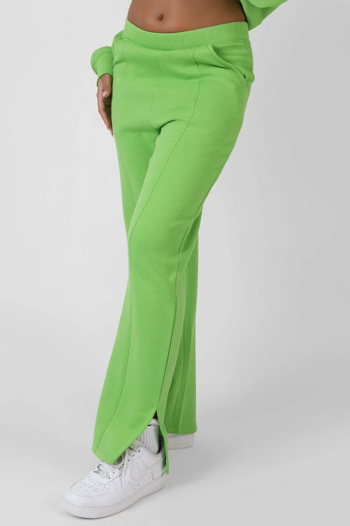 High waisted straight leg joggers in green with split hems and front seams.