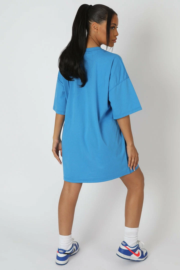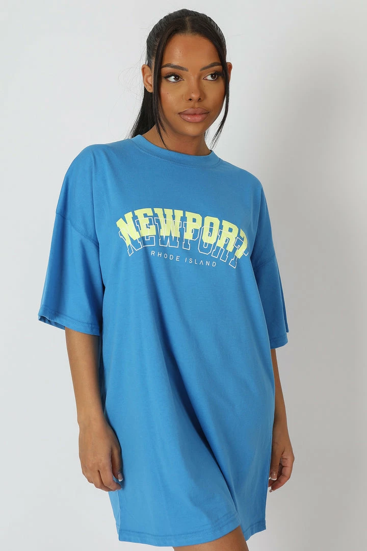 A blue oversized fit t-shirt dress with short sleeves and ‘NEWPORT’ printed on.