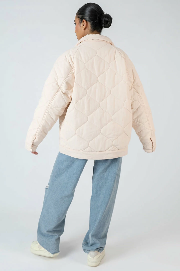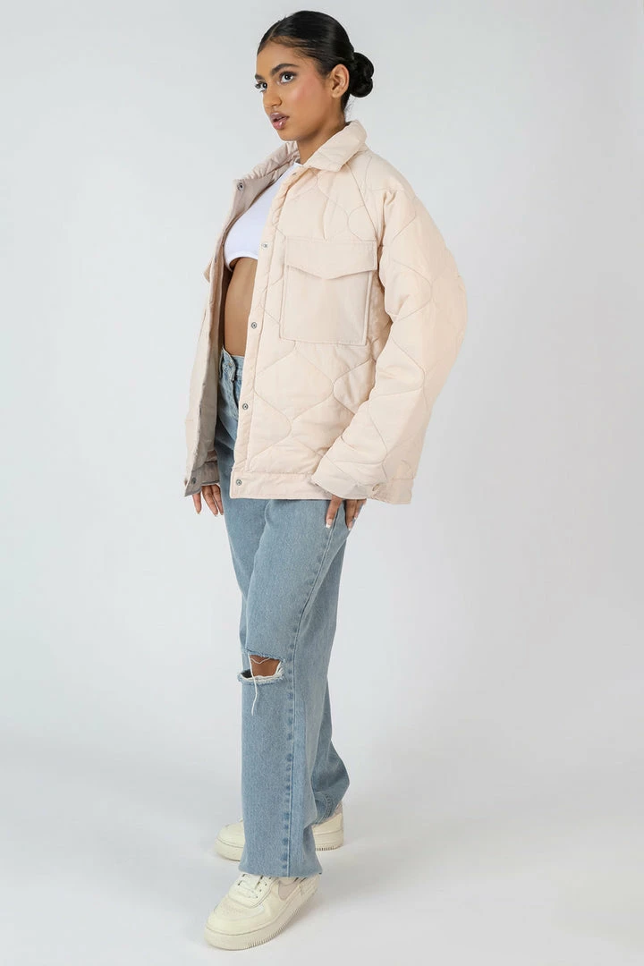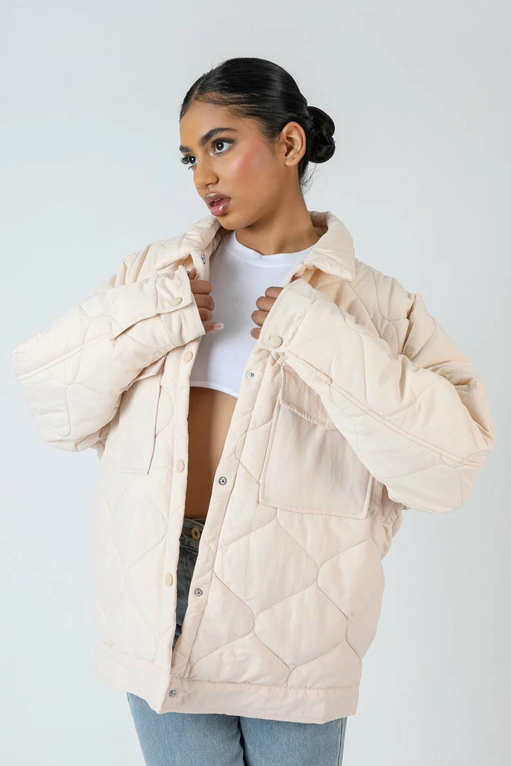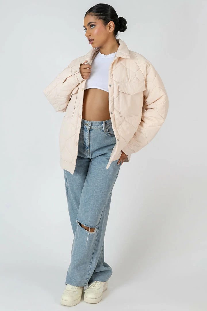 Update your wardrope this Autumn with this quilted shacket featuring front pockets, button fastenings in an ecru colour.