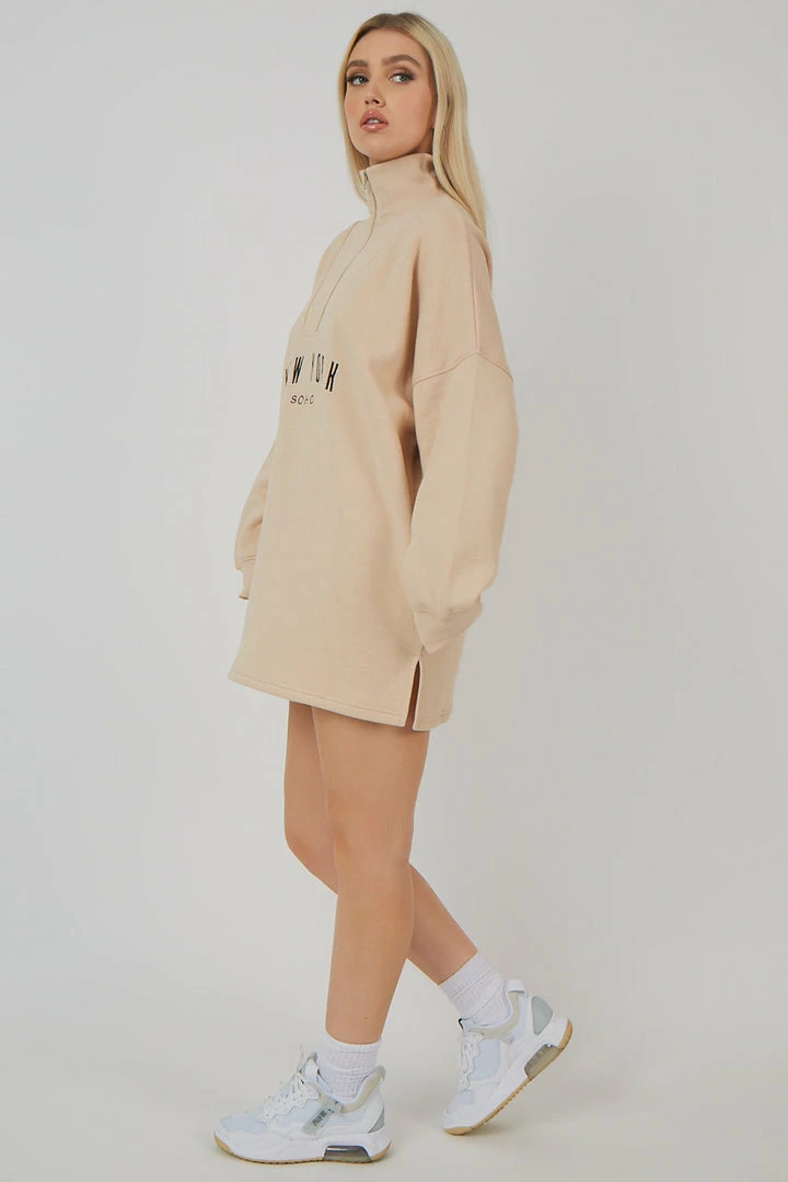 An oversized sweater dress with long sleeves, a functional half zip and ‘NEW YORK’ printed on