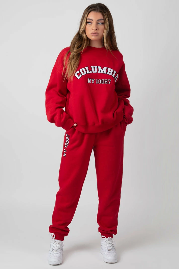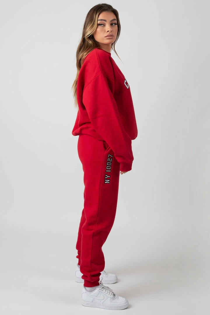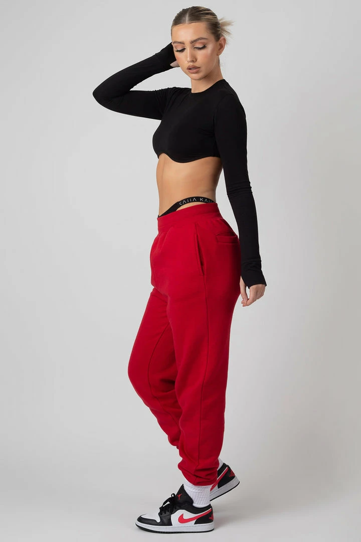 Oversized fit joggers with elasticated waists and cuffs in red featuring embroidery.