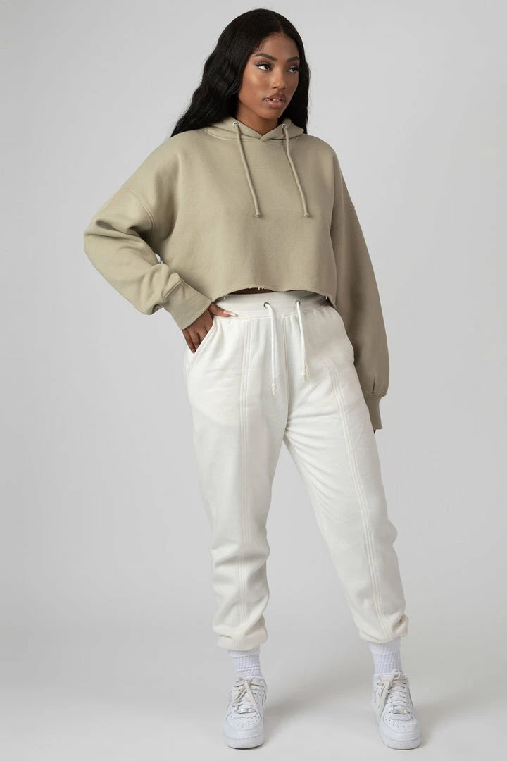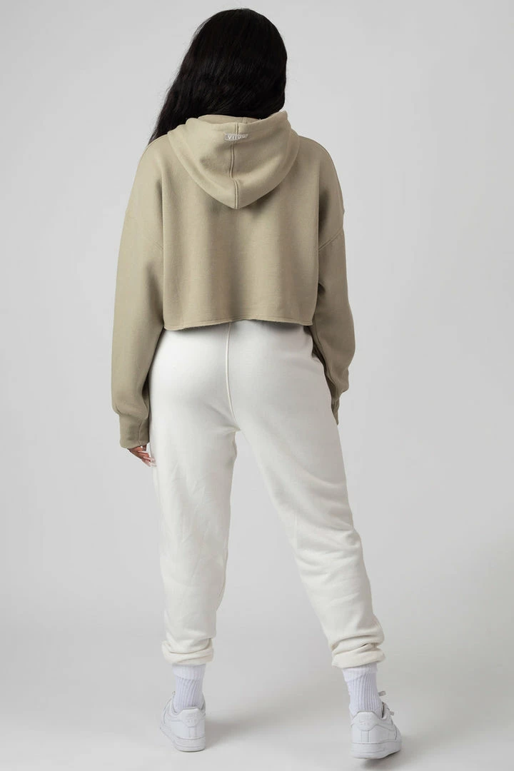 An oversized fit cropped hoodie in light khaki with a raw hem detail and cuffed sleeves