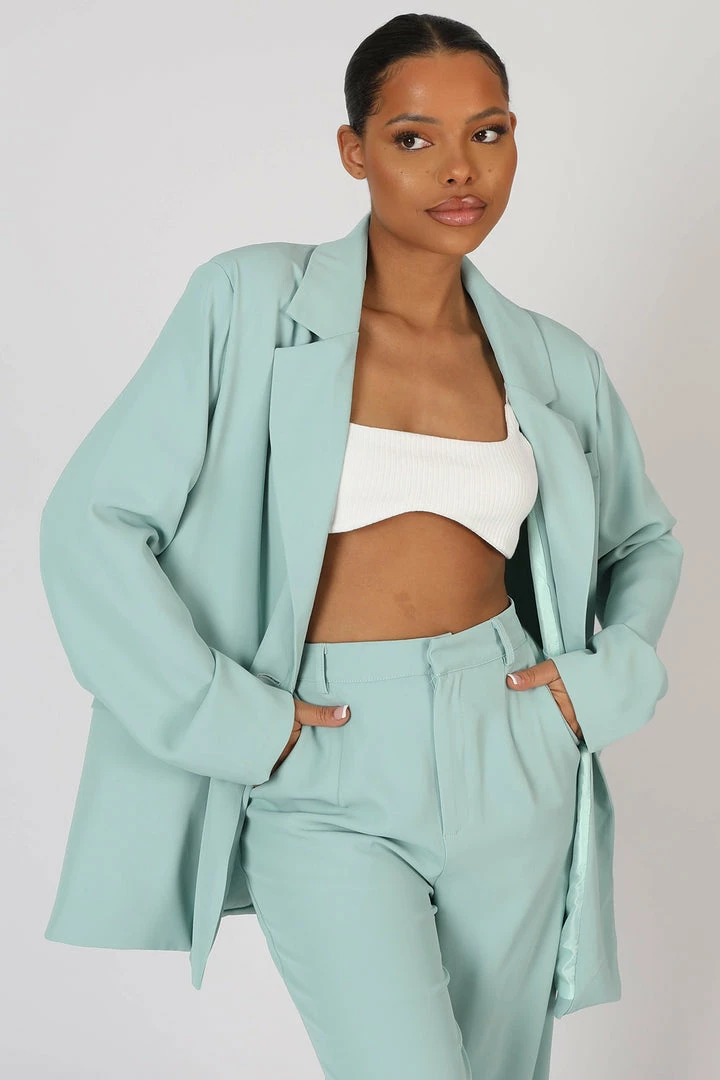 AN OVERSIZED FIT DAD STYLE BLAZER IN PEPPERMINT . PAIR WITH THE SPLIT DETAIL HIGH WAISTED DAD TROUSER PEPPERMINT FOR THE ULTIMATE SUIT SET.