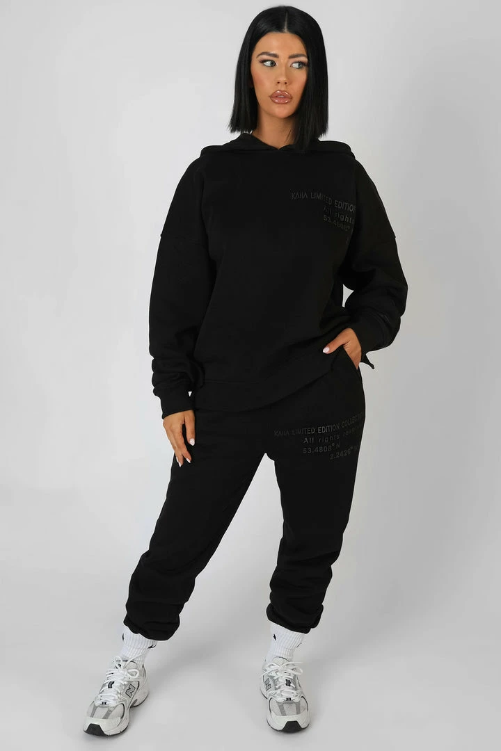 OVERSIZED FIT 90S STYLE HIGH WAISTED JOGGERS IN BLACK WITH BLACK TONAL DETAILS PRINTED ON THE FRONT. OUR ICONIC ELM TRACKSUIT IN A NEW COLOURWAY.