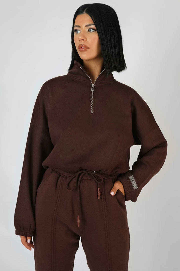 A cropped OVERSIZED FIT sweatshirt featuring a functional half zip, gathered hem and elasticated cuffs in a CHOCOLATE